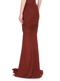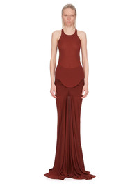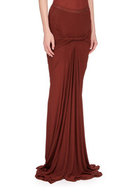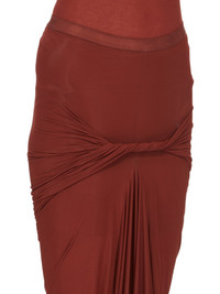 RICK OWENS SS24 LIDO TWIST SKIRT IN HENNA HEAVY STRETCH CUPRO JERSEY THIS TWIST SKIRT TRAILS FLOOR-LENGTH. IT HAS AN ELASTICIZED WAISTBAND AND A BODY-SKIMMING FIT, CREATED BY A DRAPED TWIST IN THE CENTRE FRONT BODY, WITH GATHERING RUNNING AROUND TO THE REAR. THE SKIRT FLARES AT THE CENTRE FRONT WITH A WIDE GODET THIS MEDIUMWEIGHT CUPRO JERSEY IS STRETCHY WITH A SOFT AND COOL HANDFEEL. THIS JERSEY IS MADE USING CUPRO WHICH IS BIODEGRADABLE AND 100% PLANT BASED. AS IT’S MADE FROM COTTON WASTE, CUPRO HELPS FIND A PURPOSE TO FIBERS THAT WOULD OTHERWISE BE DISCARDED - COLOR: HENNA - MATERIAL: 96% CUPRO + 4% ELASTANE - MODEL IS 181CM TALL - MODEL WEARS SIZE 40
