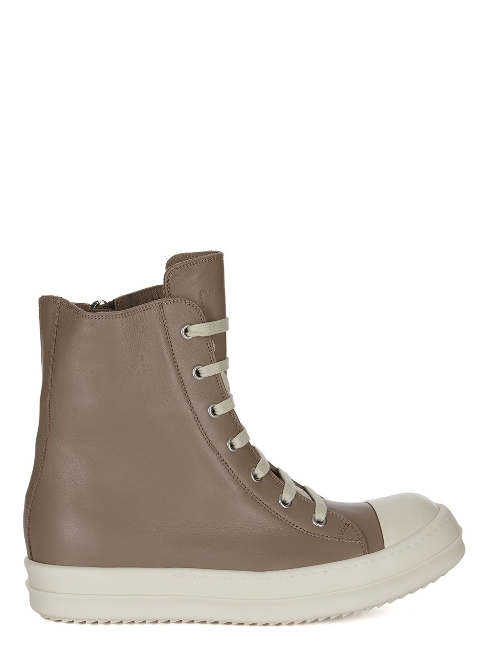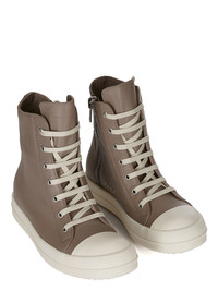RICK OWENS SS25 HOLLYWOOD SNEAKERS IN FLESH/MILK/MILK FULL GRAIN CALF LEATHER THESE SNEAKERS ARE ABOVE-ANKLE HEIGHT AND FEATURE SEVEN EYELETS, LACES, A ZIPPER ON THE INSIDE ANKLE FOR EASY FASTENING, TOE CAPS AND SHARK-TOOTHED BUMPER SOLES THIS MEDIUMWEIGHT FULL GRAIN CALF LEATHER HAS A FLAT AND MATTE SURFACE FINISH AND IS SPECIFICALLY TANNED FOR SHOES WITH AN ABRASION-RESISTANT FINISHTHIS TANNERY IS LWG CERTIFIED WITH A BRONZE RATING COLOR: FLESH/MILK/MILK MATERIAL: UPPER 100% COW LEATHERTOE 100% CALF LEATHERLINING 100% CALF LEATHER INSOLE 100% CALF LEATHERSOLE 100% THERMOPLASTIC RUBBER