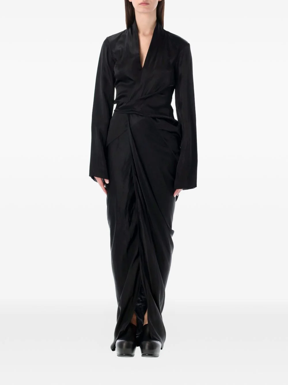 V-neck wrap maxi dress Highlights - Black - Flared sleeves - Self-tie fastening - Draped design - V-neck - Floor-length Imported Composition Cupro 100% Washing instructions Read Manufacturer Guidelines
