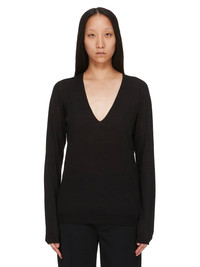 RICK OWENS SS25 HOLLYWOOD V NECK PULL IN BLACK LIGHTWEIGHT RASATO KNIT THIS V NECK PULL IS BELOW-HIP LENGTH WITH LONG SLEEVES. IT HAS A DEEP V NECK WITH SLIM KNIT EDGE AND RIBBED HEM AND CUFFS. IT FEATURES A SIGNATURE KNIT LINE RUNNING DOWN THE CENTER BACK SPINE THIS LIGHTWEIGHT AND CLASSIC STITCH WOOL KNIT HAS A SOFT HANDFEEL COLOR: BLACK MATERIAL: 100% NEW WOOL MODEL IS 181CM TALL MODEL WEARS SIZE S