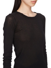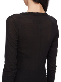 RICK OWENS SS25 HOLLYWOOD RIB LS T IN BLACK MINI RIB JERSEY THIS RIB LS T IS BELOW-HIP LENGTH WITH A SLIM FIT AND LONG SLEEVES. IT HAS A RIBBED ROUND NECK, RAW CUT HEM AND CUFFS, AND FEATURES THE SIGNATURE SINGLE SEAM RUNNING DOWN CENTER BACK SPINE THIS LIGHTWEIGHT MINI RIB JERSEY HAS A TEXTURED SURFACE AND SOFT HANDFEEL. THIS JERSEY IS MADE USING GOTS CERTIFIED ORGANIC COTTON WHICH MEANS THE NATURAL FIBER IS GROWN WITHOUT HARMFUL CHEMICALS, LEAVING OUR SOIL, AIR AND WATER CLEANER FROM CONTAMINATES WE STRIVE TO KEEP OUR PRODUCTION AS LOCAL AS POSSIBLE. THE FULL MANUFACTURING CYCLE OF THIS PRODUCT, FROM THE MATERIAL KNITTING TO SEWING AND FINISHING, WAS UNDERTAKEN CLOSE TO OUR HOME BASE IN CONCORDIA, ITALY. COLOR: BLACK MATERIAL: 100% COTTON MODEL IS 181CM TALL MODEL WEARS SIZE 40