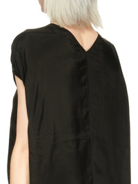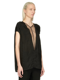 RICK OWENS SS23 EDFU V ISLAND TOP IN CUPRO JAPONETTE AND NYLON TULLE THIS V ISLAND TOP IS HIP LENGTH WITH A VOLUMINOUS FIT. IT HAS WIDE SHOULDERS WHICH FALL INTO SOFT CAP SLEEVES, CENTRE FRONT SEAM, AND ROUNDED BACK WITH DARTS AND A CENTRE BACK SEAM. IT FEATURES A V NECK WITH PLUNGING TULLE CUT OUT, A GRAPHIC BOUND EDGE, AND SOFT V BACK NECK THIS IS A COMBINATION OF CUPRO JAPONETTE AND NYLON TULLE. THIS CUPRO JAPONETTE IS LIGHTWEIGHT AND DRAPEY. WE CHOSE CUPRO FOR THIS PRODUCT BECAUSE CUPRO FIBER IS BIODEGRADABLE AND 100% PLANT BASED. AS IT’S MADE FROM COTTON WASTE, CUPRO HELPS FIND A PURPOSE TO FIBERS THAT WOULD OTHERWISE BE DISCARDED - COLOR: BLACK- MATERIAL: 100% CUPRO - DETAIL: 92% NYLON + 8% ELASTANE - MODEL IS WEARING SIZE 40 - MODEL IS 181 CM TALL