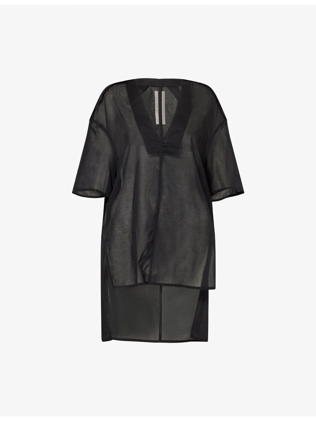 PRODUCT DETAILS - Rick Owens cotton top - 100% cotton - Relaxed fit, V-neck, short sleeves, sheer, dipped hem - Dry clean - Made in Japan - True to size - Model is 5ft 10in/1.78m and wears a size UK 8 - Lightweight, non-stretch Ref: R04583822