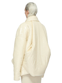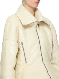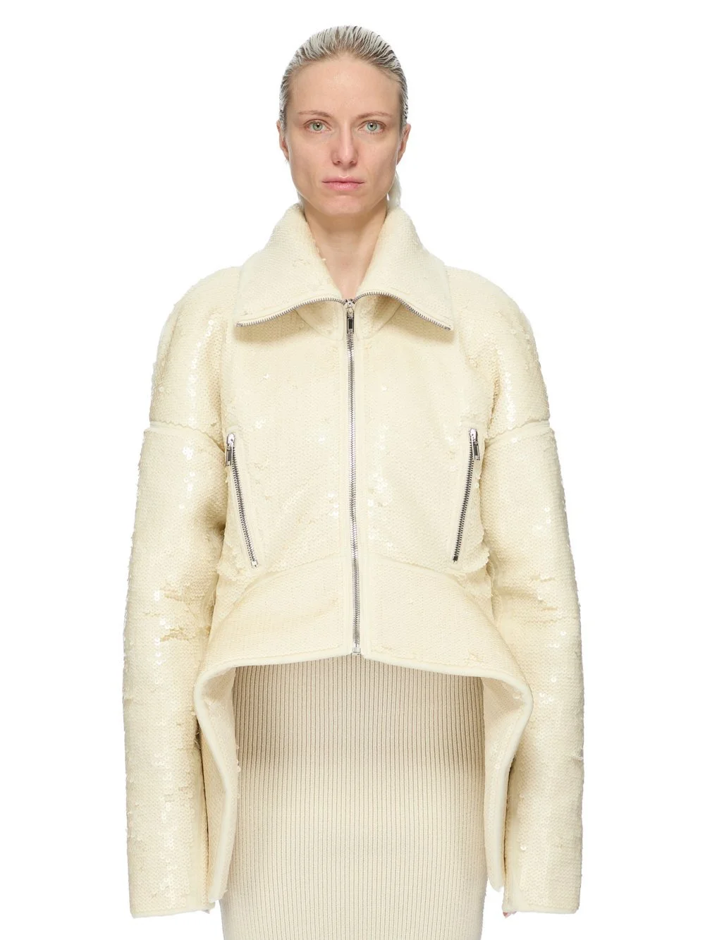 RICK OWENS FW25 CONCORDIANS RUNWAY DRACULIMO IN MILK MILK FELT AND RECYCLED TULLE THIS DRACULIMO IS BELOW WAIST LENGTH IN FRONT AND LONGER IN THE BACK. IT HAS LONG SLEEVES AND A CENTRE FRONT ZIPPER. IT FEATURES AN EXTENDED LENGTH COLLAR THAT CAN BE WORN UP OR DOWN AND HOLDS ITS SHAPE THANKS TO IT BEING REINFORCED WITH FUSING MATERIAL. IT ALSO FEATURES A FOLD IN THE BACK AND HAS A CURVED, SLIGHTLY LIFTED, FRONT HEM THAT ENDS IN POINTS AT THE SIDES. IT HAS TWO FRONT SIDE ZIPPERED POCKETS THIS IS A COMBINATION OF MILK FELT AND RECYCLED TULLE THIS HEAVYWEIGHT AND COMPACT FELT HAS A SOFT HANDFEEL THIS FABRIC IS MADE FROM BRITISH WOOL BOARD-LICENSED, NON MULESED BRITISH WOOL SOURCED EXCLUSIVLY FROM FARMS IN THE UK. THE NATURAL COLORED WOOL IS CLEANED THROUGH A GENTLE AND ACID FREE PROCESS THAT RETAINS 95% OF THE WATER IN A CLOSED-LOOP SYSTEM. THIS PROCESS ALLOWS FOR FLECKS AND FIELD MATERIAL TO REMAIN IN THE NATURAL FIBRE COLOR: MILK MATERIAL: 100% WOOL COVERING 100% NYLON SLEEVES LINING 100% CUPRO MODEL IS 181CM TALL MODEL WEARS SIZE 40
