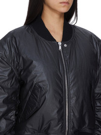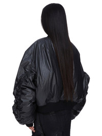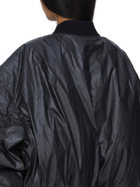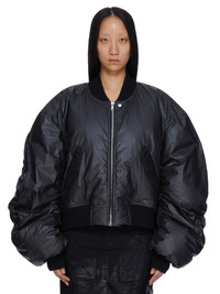 RICK OWENS FW25 CONCORDIANS RUNWAY CAL BOMBER IN BLACK COATED POPLIN THIS CAL BOMBER IS OVERSIZED WITH LONG, GATHERED SLEEVES. IT HAS A RIBBED NECK, WRIST AND WAISTBAND AND FEATURES A CENTRE FRONT ZIPPER WITH TOP SNAP. IT HAS FRONT SIDE SNAP CLOSURE POCKETS AND IS FULLY LINED WITH TWO INTERNAL ZIPPERED POCKETS THIS LIGHTWEIGHT COTTON POPLIN HAS A SEMI SHINY WATER REPELLENT WAX COATING AND A CRISPY HAND FEEL THIS FABRIC IS MADE USING GOTS CERTIFIED ORGANIC COTTON WHICH MEANS THE NATURAL FIBER IS GROWN WITHOUT HARMFUL CHEMICALS, LEAVING OUR SOIL, AIR AND WATER CLEANER FROM CONTAMINATES COLOR: BLACK MATERIAL: 93% COTTON + 7% POLYURETHANE MODEL IS 181CM TALL MODEL WEARS SIZE 40
