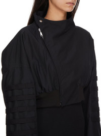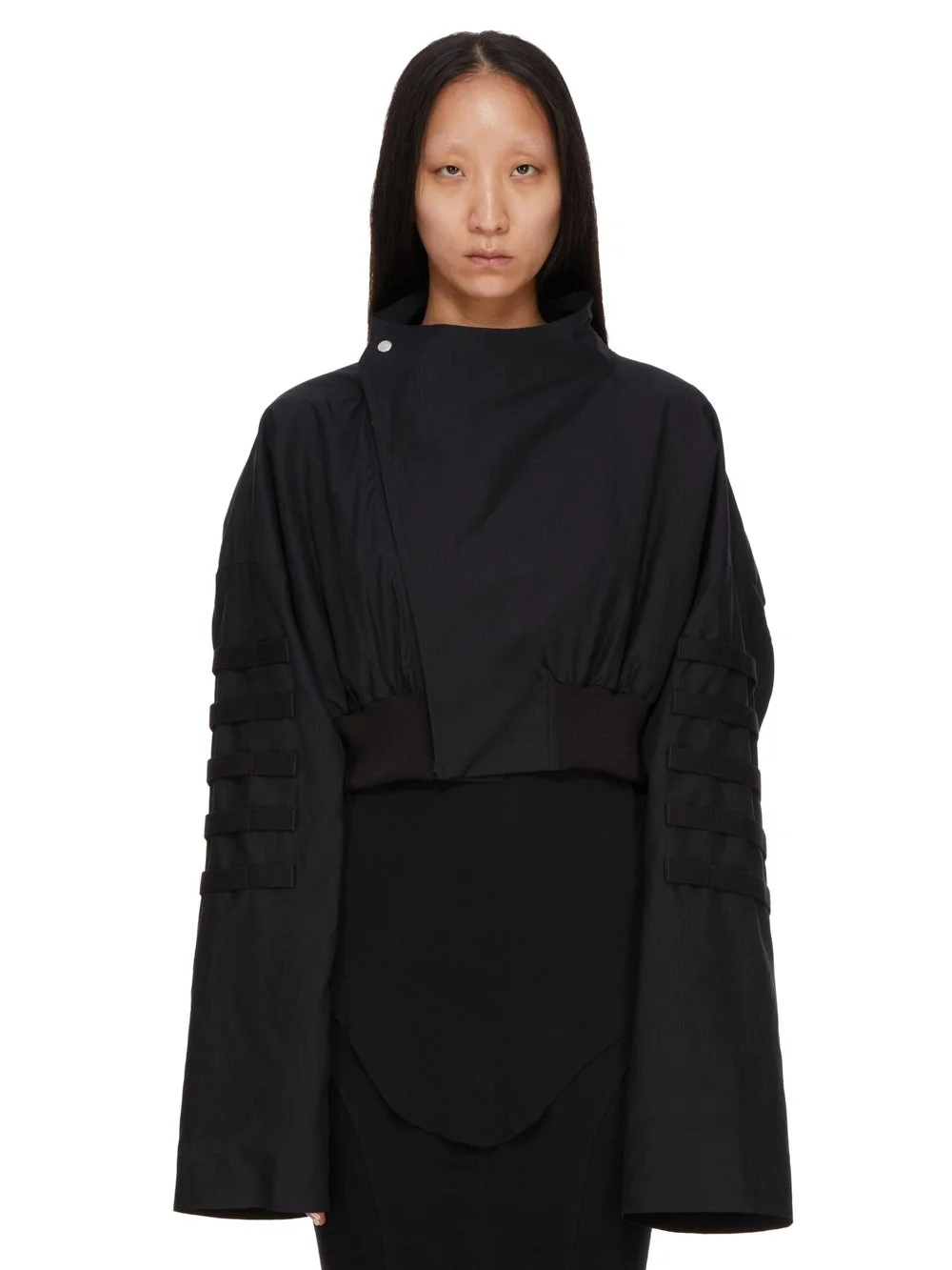 RICK OWENS SS25 HOLLYWOOD RUNWAY ANTHEM FLIGHT IN BLACK TENCEL RIPSTOP THIS ANTHEM FLIGHT JKT IS WAIST LENGTH WITH LONG, WIDE, KIMONO-LIKE SLEEVES. IT HAS AN OFF-CENTRE ZIPPER WITH TOP SNAP, A SMALL, ROUNDED, FUNNEL NECK AND RIBBED CUFF AND HEM. IT FEATURES A DOUBLE SNAP FLAP AND POCKET ACROSS THE BACK YOKE AND BACK DRAPING. IT IS FULLY LINED AND HAS INTERNAL ZIPPERED POCKETS. THIS VERSION FEATURES FIVE ROWS OF WEBBING STRAPS, ON THE ARMS. THIS IS REMINISCENT OF THOSE IN THE BONOTTO CAPSULE COLLECTION THIS SEASON THIS LIGHTWEIGHT AND AIRY RIP STOP HAS A SOFT TECHNICAL HAND FEEL AND A WATER REPELLENT FINISH TENCEL IS A CELLULOSE BASED FIBRE MADE FROM CERTIFIED WOOD PULP. IT IS PRODUCED IN A CLOSED LOOP PROCESS RECOVERING 99,8% OF WATER AND SOLVENTS USED TO PRODUCE IT. TENCEL IS BIODEGRADABLE COLOR: BLACK MATERIAL: 100% TENCEL MODEL IS 181CM TALL MODEL WEARS SIZE 40