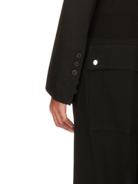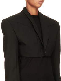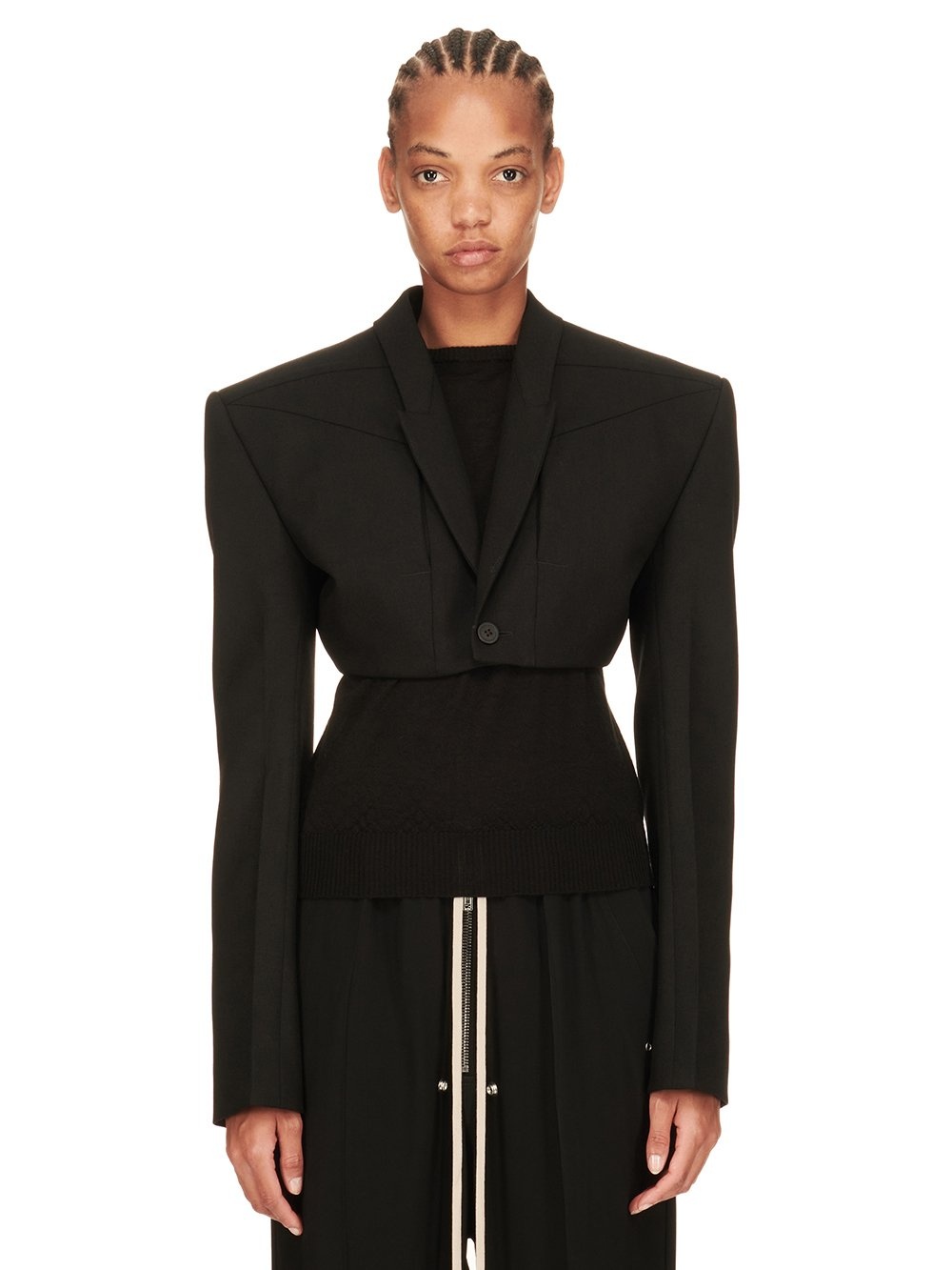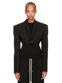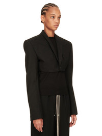 RICK OWENS FW24 PORTERVILLE MICRO TATLIN IN BLACK GRAIN DE POUDRE THIS MICRO TATLIN IS CROPPED BELOW BUST LENGTH. IT FEATURES MODULATOR, JUMBO, SHOULDERS AND LONG SLEEVES WITH 5 BUTTON CUFFS. IT HAS A SLIM LAPEL, A SINGLE BUTTON FRONT CLOSURE AND FEATURES FOG BREAST POCKETS WITH A VERTICAL OPENING AND AN INVISIBLE SNAP. IT ALSO HAS A THIN, ADJUSTABLE, COTTON WEBBING DISCO STRAP, WITH CLIP, ACROSS THE BACK YOKE THIS MEDIUMWEIGHT WOOL GRAIN DE POUDRE FABRIC HAS A ROUND AND SOFT HANDFEEL.THIS FABRIC IS MADE FROM RWS CERTIFIED VIRGIN WOOL WHICH ENSURES A HIGH STANDARD IN ANIMAL WELFARE, ENVIRONMENTAL SUSTAINABILITY AND SOCIAL RESPONSIBILITY. EACH BALE OF WOOL IS TRACEABLE BACK TO ITS SOURCE. - COLOR: BLACK - MATERIAL: 100% NEW WOOL - FRONT AND POCKETS LINING 100% COTTON - BACK AND SLEEVES LINING 100% CUPRO - BUTTONS 100% BUFFALO HORN - MODEL IS 181CM TALL - MODEL WEARS SIZE 40