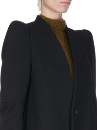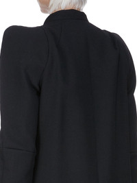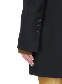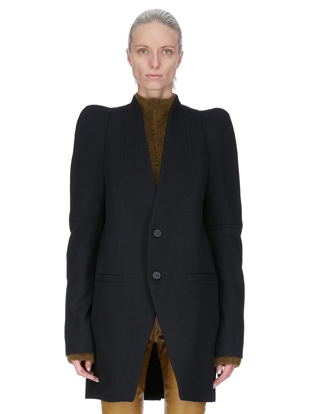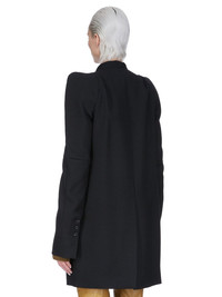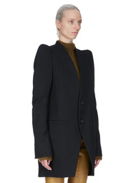 RICK OWENS FW24 PORTERVILLE METRO BLAZER IN WOOL DRILL THIS METRO BLAZER IS MID-THIGH LENGTH. IT HAS A SLIGHT SHAWL COLLAR AND V NECK WITH TWO BUTTON WRAP. IT FEATURES ROUNDED METRO SHOULDERS TRACED WITH RIDGED SEAMS, LONG SLIM SLEEVES WITH 5 BUTTON CUFFS. IT HAS SIDE FRONT WELT POCKET, A BACK YOKE AND CENTRE BACK VENT. IT IS FULLY LINED WITH TWO INTERNAL BUTTONED POCKETS THIS MEDIUMWEIGHT WOOL DRILL FABRIC HAS A DISTINCT DRILL TEXTURE AND A DRY HANDFEEL. THIS FABRIC IS MADE FROM GOTS CERTIFIED VIRGIN WOOL WHICH ENSURES A HIGH STANDARD IN ANIMAL WELFARE, ENVIRONMENTAL SUSTAINABILITY AND SOCIAL RESPONSIBILITY. EACH BALE OF WOOL IS TRACEABLE BACK TO ITS SOURCE - COLOR: BLACK - MATERIAL: 100% WOOL - FRONT AND POCKETS LINING 100% COTTON - BACK AND SLEEVES LINING 100% CUPRO - BUTTONS 100% BUFFALO HORN - MODEL IS 181CM TALL - MODEL WEARS SIZE 40