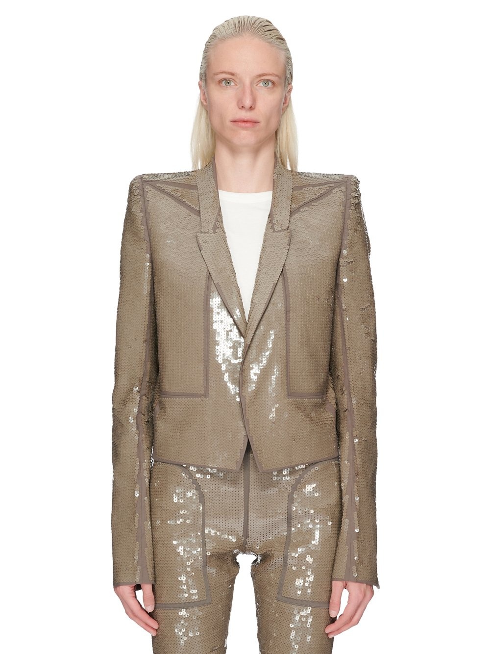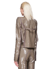 RICK OWENS SS23 EDFU FOGPOCKET NEUE ALICE IN DUST GREY SEQUIN EMBROIDERED MUSLIN THIS FOGPOCKET NEUE ALICE JACKET HAS A CROPPED BELOW WAIST LENGTH AND A CLOSE FIT. IT HAS LONG SLIM SLEEVES AND FEATURES EXAGGERATED KLAUS SHOULDERS AND A SLIM LAPEL WITH SINGLE FRONT BUTTON CLOSURE. IT HAS TWO FOG BREAST POCKETS WITH A VERTICAL OPENING AND INTERNAL SNAP AND TWO FRONT POCKETS. IT FEATURES A THIN, ADJUSTABLE, COTTON WEBBING DISCO STRAP, WITH CLIP ACROSS THE BACK YOKE. IT IS FULLY LINED AND HAS INTERNAL BUTTONED POCKETS THIS LIGHTWEIGHT GAUZE COTTON IS EMBROIDERED WITH SMALL ORNAMENTAL SEQUIN DISKS. THIS MATERIAL IS WOVEN FROM GOTS CERTIFIED ORGANIC COTTON. WE CHOSE TO MAKE THIS GARMENT USING CERTIFIED ORGANIC COTTON BECAUSE IT MEANS THE NATURAL FIBER IS GROWN WITHOUT HARMFUL CHEMICALS, WHICH LEAVES OUR SOIL, AIR AND WATER CLEANER FROM CONTAMINATES - COLOR: DUST GREY - MATERIAL: 100% COTTON - FRONT AND POCKETS LINING 100% COTTON - BACK LINING 53% VISCOSE + 47% CUPRO - SLEEVES LINING 100% CUPRO - EMBROIDERY 100% POLYESTER - MODEL IS WEARING SIZE 40 - MODEL IS 181 CM TALL