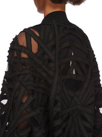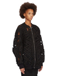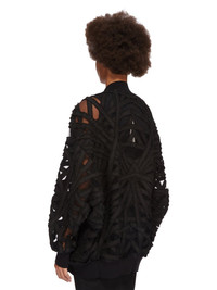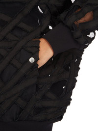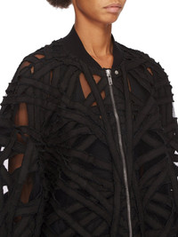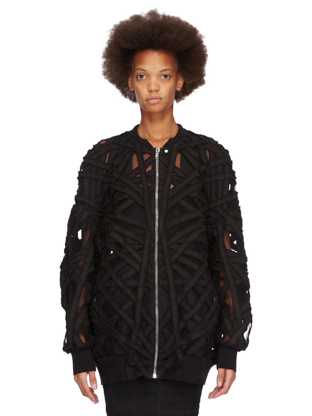 RICK OWENS SS24 LIDO RUNWAY PETER FLIGHT IN BLACK 13OZ BLACKETY BLACK DENIM AND RECYCLED TULLE THIS PETER FLIGHT IS BELOW HIP LENGTH WITH AN OVERSIZED FIT. IT HAS A CENTRE FRONT ZIPPER WITH PLACKET AND TOP SNAP, LONG SLEEVES AND LOW SHOULDERS WITH A DROPPED ARMHOLE AND LEVEL SHOULDER SEAMS. IT HAS TWO SIDE SEAM POCKETS WITH VISIBLE SNAPS AND A RIBBED COLLAR, CUFFS AND HEM THIS IS A COMBINATION OF 13OZ BLACKETY BLACK DENIM AND RECYCLED TULLE THIS 13OZ BLACK JAPANESE SELVEDGE DENIM IS GARMENT TREATED WITH A BLACK MATTE WAX FINISH THIS GARMENT IS TREATED IN AN ITALIAN WASH HOUSE BASED IN THE VENETO AREA OF ITALY, THAT PRODUCES IN SMALLER TREATMENT BATHS TO REDUCE WATER WASTE AND UTILIZE A WATER PURIFYING PROCESS THAT ENABLES THEM TO RECYCLE A PORTION OF THE WATER USED. ALL OF OUR DENIM WASHES ARE ZDHC CERTIFIED - COLOR: BLACK - MATERIAL: 100% NYLON - EMBROIDERY 100% COTTON - KNIT RIB COLLAR + WRIST BAND + BOTTOM 100% COTTON - POCKETS LINING 100% COTTON - MODEL IS 181CM TALL - MODEL WEARS SIZE 40