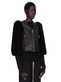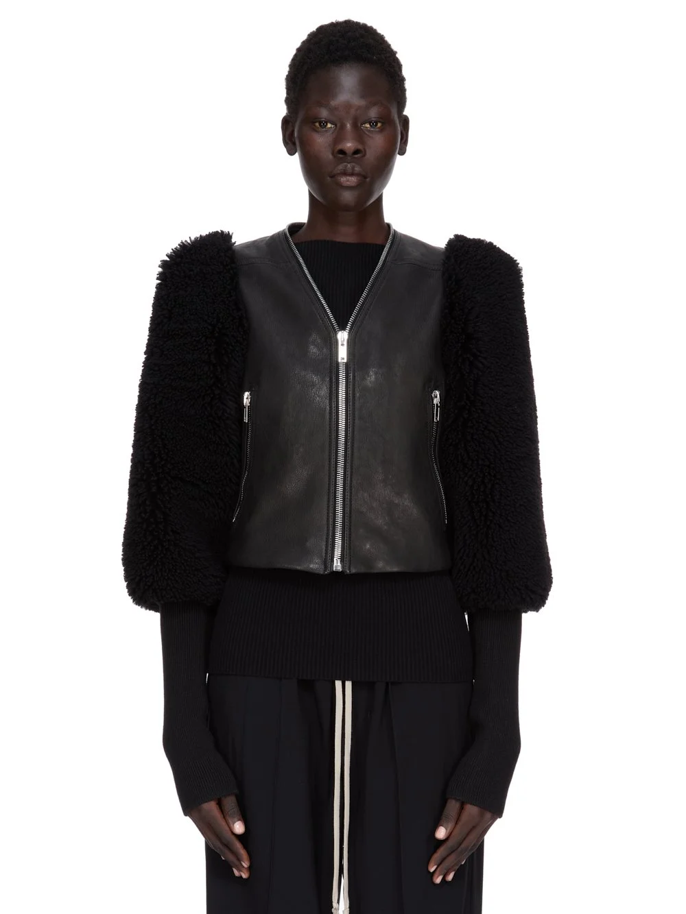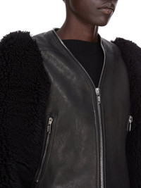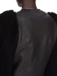 RICK OWENS FW25 CONCORDIANS CROPPED KLAUS IN BLACK CURLY SHEARLING AND WAXY GOAT LEATHER THIS CROPPED KLAUS IS WAIST LENGTH. IT HAS WIDE SHOULDERS AND LONG KNIT SLEEVES WHOSE TOP HALF, FROM SHOULDER TO ELBOW ARE COVERED IN CURLY SHEARLING. IT FEATURES A KLAUS V NECK WITH A ZIPPER THAT CLOSES TO THE CENTRE FRONT CHEST, AND THEN CONTINUES AROUND TO THE CENTRE BACK NECK THIS A COMBINATION OF CURLY SHEARLING AND WAXY GOAT LEATHER THIS MEDIUMWEIGHT GOAT LEATHER HAS A NATURAL GRAIN TEXTURE AND A WAXY HANDFEEL TANNED IN THE NAPLES AREA OF ITALY, THIS LEATHER IS TUMBLED MULTIPLE TIMES IN A LARGE DRUM IN ORDER TO BRING OUT THE NATURAL GRAIN TEXTURE OF THE SKIN. THE LEATHER IS FINISHED WITH NATURAL WAXES IN ORDER TO ACHIEVE THE NATURAL AND WAXY HANDFEEL BECAUSE THIS SKIN IS NAKED, NOT FINISHED USING ANY PIGMENTS COVERING THE SKIN, NATURAL MARKINGS AND SHADINGS ARE VISIBLE WHICH MAKES EACH SKIN AND PRODUCT UNIQUE VEG TANNING MEANS ONLY VEGETAL AND NATURAL TANNINS WERE USED IN THE PROCESS OF TANNING AND PRESERVING THIS LEATHER THIS TANNERY IS LWG CERTIFIED WITH A GOLD RATING COLOR: BLACK MATERIAL: 100% RAM LEATHER SLEEVES 100% LAMB SHEARLING REAL FUR KNIT RIB ARM WARMERS 96% NEW WOOL + 3% NYLON + 1% ELASTANEBODY AND POCKETS LINING 100% COTTON BODY PADDING 100% POLYESTER MODEL IS 181CM TALL MODEL WEARS SIZE 40