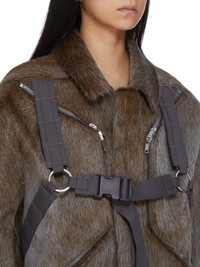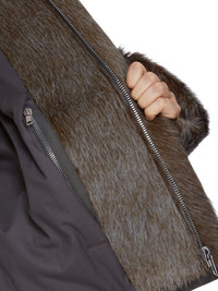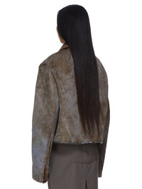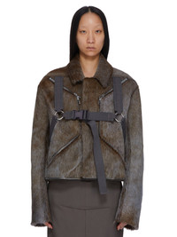 RICK OWENS FW25 CONCORDIANS RUNWAY BLIXA JUMBO JKT IN INDIGO MELANGE UNSHAVED COW LEATHER THIS BLIXA JUMBO JKT IS WAIST LENGTH WITH LONG SLEEVES AND A SQUARE FIT. IT HAS A CLASSIC COLLAR AND A CENTRE ZIPPER OPENING, BLIXA TWO-WAY ZIPPERED CHEST POCKETS AND TWO LOWER FLAP POCKETS ON FRONT AS WELL AS THE HARNESS DETAIL ON FRONT CHEST. IT FEATURES A ZIP HEM, ALLOWING PIECES TO BE CONVERTED INTO LONGER GARMENTS. IT IS FULLY LINED WITH TWO INTERNAL ZIPPERED POCKETS THIS HEAVYWEIGHT LEATHER IS A HAIR-ON COWHIDE WITH NATURAL LENGTH COARSE HAIR. IT HAS BEEN TREATED WITH A CORROSION TREATMENT WHICH CREATES AN IRREGULAR INDIGO AND BROWN MELANGE COLORATION THIS LEATHER IS TANNED IN THE VENETO AREA OF ITALY BY A TANNERY SPECIALIZED IN HAIR-ON COW LEATHER. BECAUSE THE HAIR IS NATURAL THERE CAN BE INCONSISTENCY IN THE LENGTH DIRECTION, TEXTURE AND COLOR THIS TANNERY IS LWG CERTIFIED WITH A SILVER RATING COLOR: INDIGO MATERIAL:100% COW REAL FUR MODEL IS 181CM TALL MODEL WEARS SIZE 42