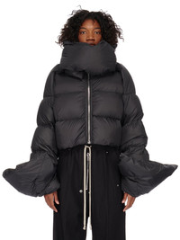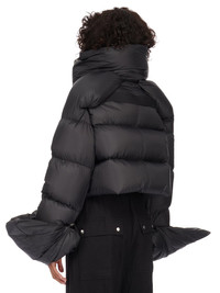 RICK OWENS FW23 LUXOR BABEL MOUNTAIN DUVET CROPPED IN BLACK RECYCLED NYLON THIS BABEL MOUNTAIN CROPPED IS BELOW WAIST LENGTH WITH A CENTRE FRONT ZIPPER, HIGH A FUNNEL-NECK COLLAR WITH THREE SNAP CLOSURES. IT CAN BE WORN WRAPPED AROUND OR HANGING OPEN TO EXPOSE THE NECK. IT IS A HEAVYWEIGHT DUVET, QUILTED WITH HORIZONTAL STITCHING LINES. IT HAS LONG SLEEVES WITH EXTRA LONG CUFFS THAT CAN BE FOLDED BACK. THE RAGLAN SHOULDER HAS THREE SNAP CLOSURES WHICH CAN BE UNDONE AND FOLDED DOWN TO REVEAL SHOULDERS, OR THE JACKET CAN BE WORN AS A VEST WITH ARMS OUT AND THE SLEEVES HANGING BEHIND. IT FEATURES A SIGNATURE COTTON WEBBING STRAP, WITH RIVET DETAIL, ACROSS THE BACK YOKEIT HAS TWO INTERNAL ZIPPERED POCKETS THIS AIRY AND LIGHTWEIGHT NYLON IS MADE USING GRS CERTIFIED RECYCLED NYLON WHICH ENSURES A REDUCTION IN WATER CONSUMPTION, EMISSIONS AND HAZARDOUS WASTE, LESSENING THE DEPENDENCE ON NON-RENEWABLE RESOURCES - COLOR: BLACK - MATERIAL: 100% NYLON - PADDING 90% GOOSE DOWN + 10% MALLARD FEATHERS - MODEL IS WEARING SIZE 40 - MODEL IS 181 CM TALL