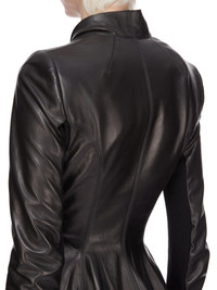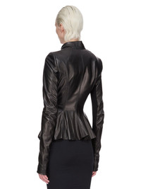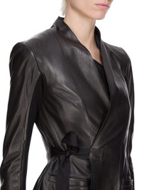 RICK OWENS FW25 CONCORDIANS HOLLYWOOD JKT IN BLACK WAXY LAMB LEATHER THIS HOLLYWOOD JKT IS ABOVE HIP LENGTH WITH LONG SLIM SLEEVES WITH AN UNDERSIDE IN KNIT. IT HAS A COLLARLESS V NECK WITH A DOUBLE BREASTED FRONT WHICH WRAPS AND SECURES WITH A TIE AND INTERNAL CONCEALED ELASTIC BELT. IT IS A FITTED SHAPE THAT FLARES OVER THE HIPS, WITH SIDE BACK VENTSIT IS PARTIALLY LINED WITH TWO INTERNAL BUTTONED POCKETS THIS LIGHTWEIGHT LAMB LEATHER IS FINISHED USING NATURAL WAXES AND ANILINE WHICH MAKES A SUPPLE HANDFEEL BECAUSE THIS SKIN IS NAKED, NOT FINISHED USING ANY PIGMENTS COVERING THE SKIN, NATURAL MARKINGS AND SHADINGS ARE VISIBLE WHICH MAKES EACH SKIN AND PRODUCT UNIQUE THIS TANNERY IS LWG AUDITED COLOR: BLACK MATERIAL: 100% LAMB LEATHER KNIT RIB UNDER SLEEVES 100% NEW WOOL FRONT LINING 30% VISCOSE + 30% NYLON + 20% ANGORA + 20% WOOLYOKE AND SLEEVES LINING 100% CUPRO POCKETS LINING 100% COTTON BUTTONS 100% BUFFALO HORN MODEL IS 181CM TALL MODEL WEARS SIZE 40