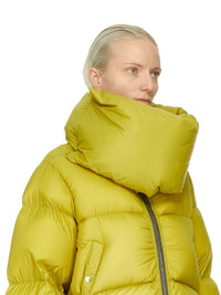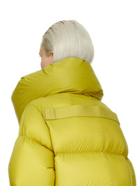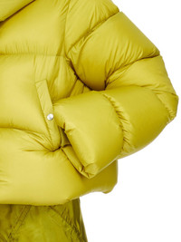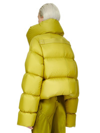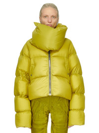 RICK OWENS FW23 LUXOR FUNNEL NECK JKT IN RECYCLED NYLON THIS FUNNEL NECK JKT IS CROPPED BELOW THE WAIST WITH A CENTRE FRONT ZIPPER, A FUNNEL-NECK COLLAR WITH THREE SNAP CLOSURES. IT CAN BE WORN WRAPPED AROUND OR HANGING OPEN TO EXPOSE THE NECK. IT IS PADDED AND QUILTED WITH HORIZONTAL STITCHING LINES AND HAS TWO SIDE SNAP POCKETS. IT FEATURES A SIGNATURE COTTON WEBBING STRAP, WITH RIVET DETAIL, ACROSS THE BACK YOKE THIS AIRY AND LIGHTWEIGHT NYLON IS MADE USING GRS CERTIFIED RECYCLED NYLON WHICH ENSURES A REDUCTION IN WATER CONSUMPTION, EMISSIONS AND HAZARDOUS WASTE, LESSENING THE DEPENDENCE ON NON-RENEWABLE RESOURCES - COLOR: ACID YELLOW - MATERIAL: 100% NYLON - KNIT RIB CUFF 100% NEW WOOL - POCKETS LINING 100% COTTON - PADDING 90% GOOSE DOWN + 10% MALLARD FEATHERS - MODEL IS WEARING SIZE 40 - MODEL IS 181 CM TALL
