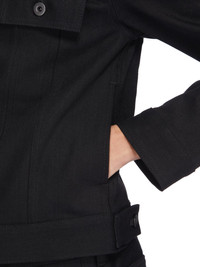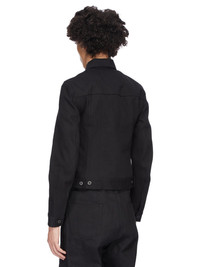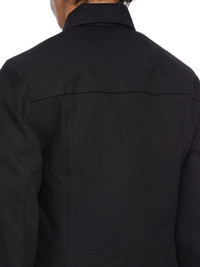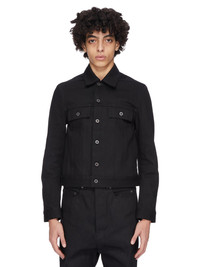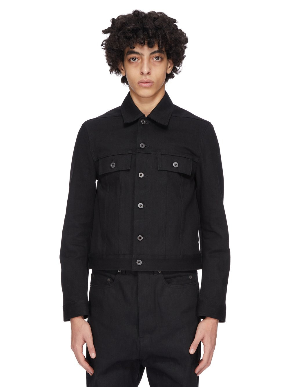 DRKSHDW FW25 CONCORDIANS TRUCKER JKT IN 16OZ BLACK DENIM THIS TRUCKER JKT IS ABOVE HIP LENGTH. IT HAS A CENTRE FRONT PLACKET WITH VISIBLE BUTTON CLOSURES, A CLASSIC COLLAR, TWO CHEST POCKETS WITH FLAPS AND BUTTONS, AND SIDE SEAM POCKETS. IT HAS LONG SLEEVES WITH BUTTONED CUFFS, SIGNATURE LEVEL SHOULDER SEAMS, A FRONT AND BACK YOKE AND VERTICAL SEAMED PANELS WITH DOUBLE TOP STITCHING THIS HEAVYWEIGHT 16OZ DENIM IS WOVEN IN IBARA CITY, OKAYAMA PREFECTURE, JAPAN, BY YAMAASHI ORIMONO (EST. 1945) ON VINTAGE SAKAMOTO SHUTTLE LOOMS. USING BLACK WARP AND BLACK WEFT YARNS, WITH BLACK SELVEDGE COLOR: BLACK MATERIAL: 100% COTTON MODEL IS 189CM TALL MODEL WEARS SIZE S