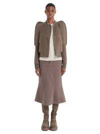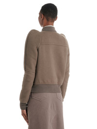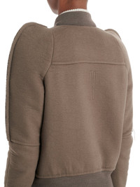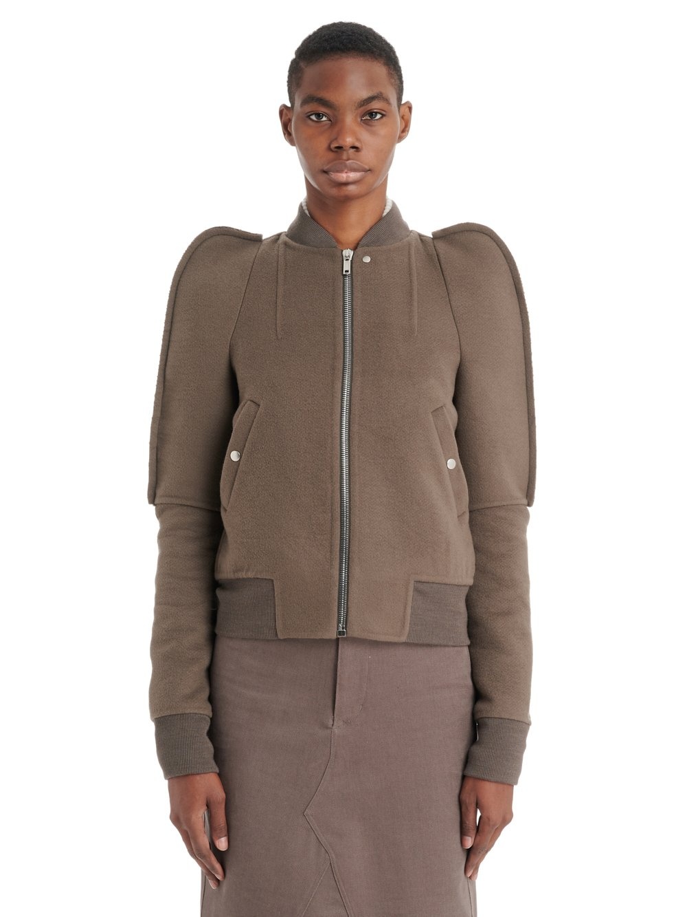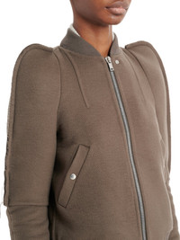RICK OWENS FW22 STROBE ZIONIC BOMBER IN DUST GREY DOUBLE CASHMERE THIS ZIONIC BOMBER IS BELOW WAIST LENGTH WITH A CENTRE ZIPPER WITH TOP SNAP DETAIL. IT HAS ROUNDED ZIONIC SHOULDERS AND LONG SLEEVES WITH RIBBED CUFFS. IT HAS SIDE POCKETS WITH SNAPS AND A RIBBED WAISTBAND THIS COATING QUALITY IS DOUBLE LAYERS OF PURE CASHMERE WASHED FOR ADDED SOFTNESS - COLOR: DUST GREY - MATERIAL: 100% CASHMERE - KNIT RIB COLLAR + WRIST BAND + BOTTOM 100% NEW WOOL - SLEEVES AND YOKE LINING 53% VISCOSE + 47% CUPRO POCKETS LINING 100% COTTON - MODEL IS WEARING SIZE 40 - MODEL IS 181 CM TALL