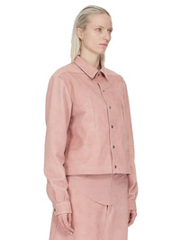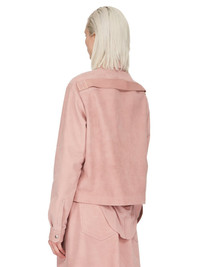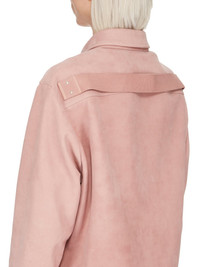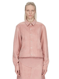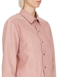 RICK OWENS SS24 LIDO ALICE STROBE SHIRT IN DUSTY PINK GRAINY NUBUCK THIS ALICE STROBE SHIRT IS WAIST LENGTH WITH LONG SLEEVES. IT HAS A CENTRE FRONT OPENING WITH VISIBLE SNAP CLOSURES, A CLASSIC COLLAR, DOUBLE TOPSTITCHING AND SNAP CUFFS. IT FEATURES TWO FOG BREAST POCKETS WITH A VERTICAL OPENING AND INTERNAL SNAP AND HAS SIGNATURE LEVEL SHOULDER SEAMS AND A COTTON WEBBING STRAP WITH RIVET DETAIL ON THE BACK YOKE. IT IS FULLY LINED AND HAS INTERNAL ZIPPERED POCKETS THIS MEDIUMWEIGHT CALF LEATHER HAS A SUBTLE GRAIN TEXTURE AND A SOFT, BRUSHED NUBUCK HANDFEEL. THIS TANNERY IS LWG CERTIFIED WITH A SILVER RATING. - COLOR: DUSTY PINK - MATERIAL: 100% COW LEATHER - FRONT AND POCKETS LINING 100% COTTON - BACK LINING 53% VISCOSE + 47% CUPRO - SLEEVES LINING 100% CUPRO - MODEL IS 181CM TALL - MODEL WEARS SIZE 40