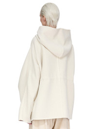 RICK OWENS FW25 CONCORDIANS ZIPFRONT HOODED JKT IN MILK/PEARL DOUBLE CAMEL THIS ZIPFRONT HOODED JKT IS HIP LENGTH WITH A VOLUMINOUS FIT. IT HAS WIDE SHOULDERS WHICH FALL INTO LONG SLEEVES, AND AN OFF-CENTRE FRONT ZIPPER THAT REACHES UP UNDER THE CHIN AND A LARGE HOOD. IT FEATURES A STITCHED WAISTBAND WITH INNER CORD WHICH CAN PULL THE JACKET IN, TO GATHER AT THE WAIST AND CREATE A PEPLUM SHAPE. THIS HEAVYWEIGHT DOUBLE CAMEL QUALITY IS WOVEN FROM FINE BABY CAMEL YARNS AND FINISHED BY WASHING AND TUMBLING. IT HAS A WARM AND SOFT HANDFEEL. THE HIGH GRADE CAMEL HAIR USED IN THIS PRODUCT DERIVE FROM BACTRIAN CAMELS, A LONG HAIRED CAMEL NATIVE TO THE CENTRAL ASIAN STEPPES. INSTEAD OF SHEERING, THE HAIR IS COLLECTED BY BRUSHING THE CAMELS WHEN THEY NATURALLY LOOSE THEIR WINTER COAT. COLOR: MILK/PEARL MATERIAL: 97% CAMEL HAIR + 3% NEW WOOL MODEL IS 181CM TALL ITEM IS AVAILABLE IN ONE SIZE