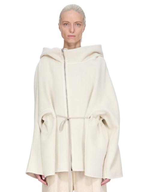 RICK OWENS FW25 CONCORDIANS ZIPFRONT HOODED JKT IN MILK/PEARL DOUBLE CAMEL THIS ZIPFRONT HOODED JKT IS HIP LENGTH WITH A VOLUMINOUS FIT. IT HAS WIDE SHOULDERS WHICH FALL INTO LONG SLEEVES, AND AN OFF-CENTRE FRONT ZIPPER THAT REACHES UP UNDER THE CHIN AND A LARGE HOOD. IT FEATURES A STITCHED WAISTBAND WITH INNER CORD WHICH CAN PULL THE JACKET IN, TO GATHER AT THE WAIST AND CREATE A PEPLUM SHAPE THIS HEAVYWEIGHT DOUBLE CAMEL QUALITY IS WOVEN FROM FINE BABY CAMEL YARNS AND FINISHED BY WASHING AND TUMBLING. IT HAS A WARM AND SOFT HANDFEEL THE HIGH GRADE CAMEL HAIR USED IN THIS PRODUCT DERIVE FROM BACTRIAN CAMELS, A LONG HAIRED CAMEL NATIVE TO THE CENTRAL ASIAN STEPPES. INSTEAD OF SHEERING, THE HAIR IS COLLECTED BY BRUSHING THE CAMELS WHEN THEY NATURALLY LOOSE THEIR WINTER COAT COLOR: MILK/PEARL MATERIAL: 97% CAMEL HAIR + 3% NEW WOOL MODEL IS 181CM TALL ITEM IS AVAILABLE IN ONE SIZE
