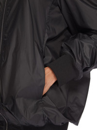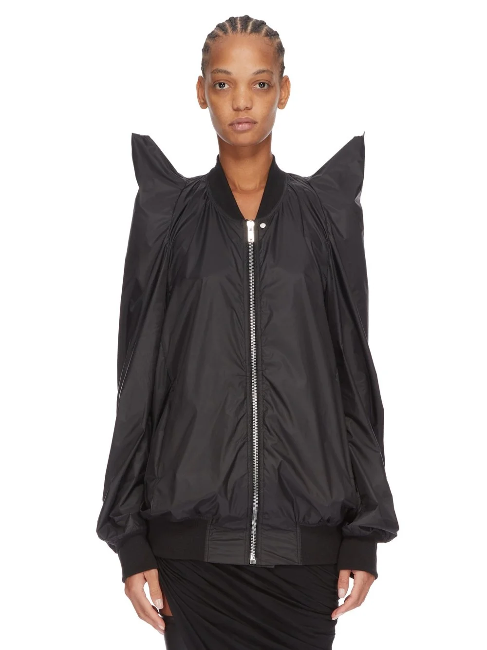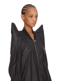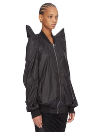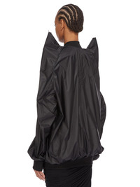 RICK OWENS SS25 HOLLYWOOD RUNWAY TEC FLIGHT IN BLACK LIGHT NYLON THIS TEC FLIGHT IS BELOW HIP LENGTH WITH AN AMPLE FIT. IT HAS A CENTRE FRONT ZIPPER WITH TOP SNAP DETAIL, RIBBED COLLAR, CUFFS AND WAISTBAND. IT FEATURES SIDE POCKETS AND LONG SLEEVES WITH EXAGGERATED TEC SHOULDERS WHICH RISE INTO ROUNDED POINTS. IT IS UNLINED THIS AIRY AND LIGHTWEIGHT NYLON IS MADE USING GRS CERTIFIED RECYCLED NYLON WHICH ENSURES A REDUCTION IN WATER CONSUMPTION, EMISSIONS AND HAZARDOUS WASTE, LESSENING THE DEPENDENCE ON NON-RENEWABLE RESOURCES COLOR: BLACK MATERIAL: 100% POLYAMIDE MODEL IS 181CM TALL MODEL WEARS SIZE 40
