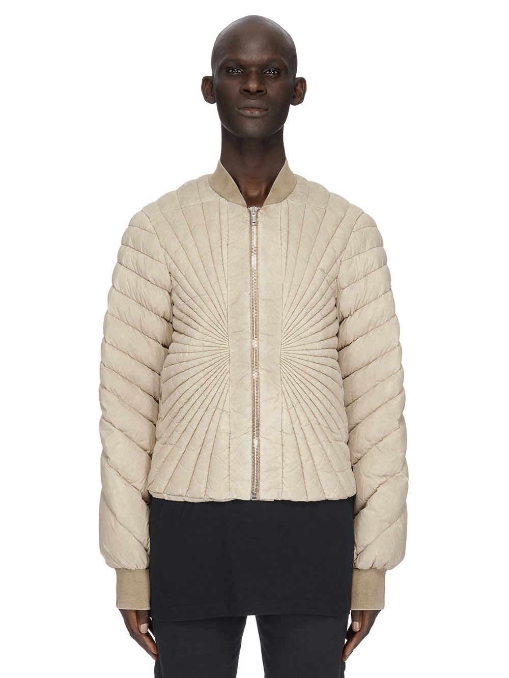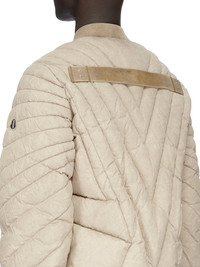 MONCLER + RICK OWENS FW23 RADIANCE FLIGHT JKT IN DIRT NYLON THIS RADIANCE FLIGHT JKT IS BELOW WAIST LENGTH. IT HAS A VISIBLE, CENTRAL ZIPPER CLOSURE, SIDE POCKETS WITH SNAP CLOSURE AND A RIBBED COLLAR AND CUFFS. IT FEATURES AN EXCLUSIVE RICK OWENS RADIANCE STITCHING DESIGN ALL OVER AND HAS A COTTON WEBBING STRAP, WITH RIVET DETAIL, ACROSS THE BACK YOKE AND A SMALL RICK OWENS X MONCLER LOGO ON THE TOP LEFT SLEEVE. IT HAS INTERNAL ZIPPERED POCKETS THIS IS AN AIRY AND LIGHTWEIGHT NYLON DUVET FABRIC. THIS GARMENT IS DYED BY HAND USING NATURAL DYES. SINCE EACH STEP OF THIS PROCESS IS MANUAL AND THE DYES USED ARE NATURAL, EACH PIECE WILL HAVE ITS OWN UNIQUE COLORATION, SHADINGS, SPOTS AND MARKS. THIS IS AN INHERENT CHARACTERISTIC OF THIS TYPE OF TREATMENT AND IS A DESIRED VISUAL ASPECT WHICH ADDS TO THE UNIQUENESS OF EACH PIECE. - COLOR: DIRT - MATERIAL: 100% NYLON - INSERT 90% COTTON + 9% NYLON + 1% ELASTANE - LINING 100% NYLON - PADDING 90% GOOSE DOWN + 10% GOOSE FEATHERS - MALE MODEL IS WEARING SIZE 2, FEMALE MODEL IS WEARING SIZE 0 - MALE MODEL IS 189 CM TALL, FEMALE MODEL IS 181 CM TALL