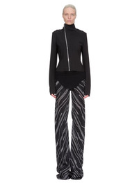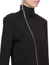 RICK OWENS FW25 CONCORDIANS GARY JKT IN BLACK STRETCH WOOL THIS GARY JACKET IS BELOW WAIST LENGTH WITH A SKIN TIGHT FIT. IT HAS LONG SLEEVES, A HIGH NECK WITH AN ASYMMETRICAL ZIP FRONT OPENING AND LEVEL SHOULDER SEAMS WITH TOPSTITCHING THIS MEDIUMWEIGHT STRETCH WOOL FABRIC IS A DOUBLE SATIN WEAVE WITH A SOFT HANDFEEL. THE POLYAMIDE AND ELASTANE CONTENT IS THERE TO GUARANTEE COMFORT COLOR: BLACK MATERIAL: 87% NEW WOOL + 10% NYLON + 3% ELASTANE MODEL IS 181CM TALL MODEL WEARS SIZE 40