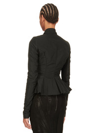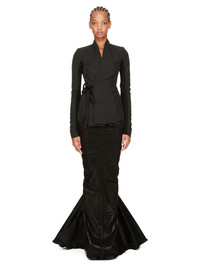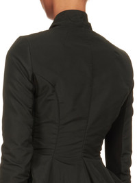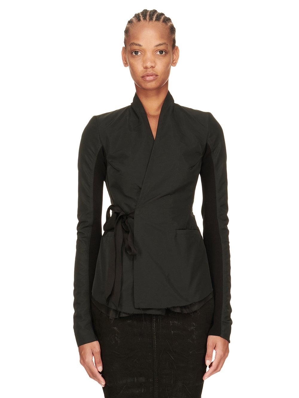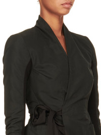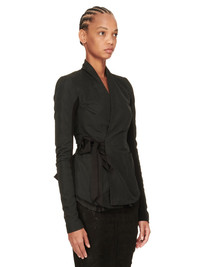 self-tie layered blazer Highlights - Black - Twill weave - Stand-up collar - Shoulder pads - Long sleeves - Contrasting panel detail - Fitted waistline - Overlapping panel - Two side welt pockets - Layered details - Internal logo tag - Frayed hem - Self-tie fastening Made in Italy Composition Lining: Cotton 100%, Viscose 53%, Cupro 47% Outer: Buffalo Horn 100%, Recycled Polyester 100%, Cotton 100% SIZE & FIT Model measurements Height 5 ft 11 in(1.8 m) Bust/Chest 31.1 in(79 cm) Hips 35.03 in(89 cm) Waist 24.8 in(63 cm) FittingInformation Designed for a slim fit that sits just away from the body offering a close yet comfortable fit The tie fastening gives an adaptable and personalised fit Made from a midweight non-stretch fabric This piece fits true to size – take your usual size