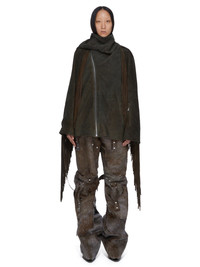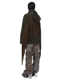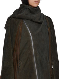 RICK OWENS FW25 CONCORDIANS RUNWAY SCARF FLIGHT IN INDIGO INDIGO SUEDE THIS SCARF FLIGHT IS BELOW HIP LENGTH AND HAS LONG WIDE SLEEVES. IT FEATURES AN OFF CENTRE ZIPPER CLOSURE THAT CLOSES ON THE SIDE NECK AND IS COVERED BY AN ATTACHED SCARF SEGMENT THAT IS WORN OVER THE RIGHT SHOULDER. IT HAS A BELT AT WAIST HEIGHT THAT FASTENS WITH A BUCKLE. IT HAS SHOULDER SEAM FOLD DETAIL, A CONCEALED ZIPPED POCKET IN THE LEFT FOREARM AND SIDE SEAM POCKETS. IT IS FULLY LINED WITH INTERNAL ZIPPERED POCKETS. THIS VERSION HAS A FRINGED BACK AND SLEEVES THIS MEDIUMWEIGHT CROSTA COW SUEDE LEATHER IS MATTE WITH A HAIRY SURFACE TEXTURE. IT IS DYED USING NATURAL INDIGO AND WASHED SEVERAL TIMES TO ACHIEVE ITS FINAL LOOK. IT HAS A NATURAL AND WAXY HAND FEEL ACHIEVED BY DRUMMING THE SKINS WITH WAX SINCE THE INDIGO USED TO DYE THIS LEATHER IS NATURAL, SHADINGS AND COLOR VARIATIONS WILL BE PRESENT. THE COLOR WILL CONTINUE TO EVOLVE AND CHANGE WITH WEAR AND AS IT GET EXPOSED TO LIGHT AND HUMIDITY THIS TANNERY IS LWG CERTIFIED WITH A GOLD RATING COLOR: INDIGO MATERIAL: 100% CALF LEATHER BODY AND POCKETS LINING 100% COTTON SLEEVES LINING 100% CUPROMODEL IS 181CM TALL MODEL WEARS SIZE 40