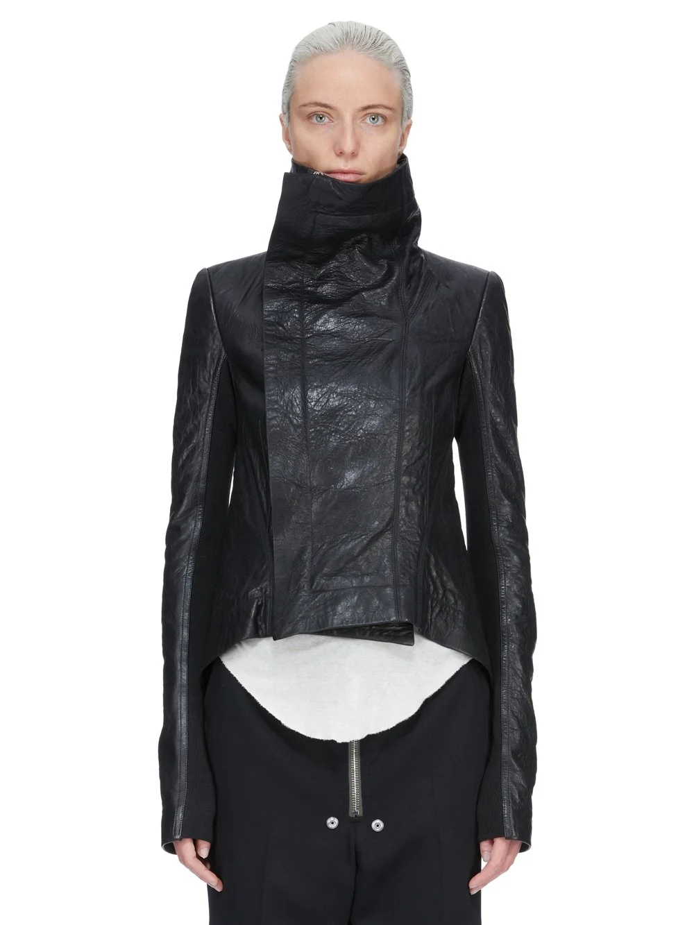 RICK OWENS SS26 TEMPLE NASKA BIKER IN BLACK TUMBLED LAMB THIS NASKA BIKER IS BELOW-WAIST LENGTH. IT FEATURES A DOUBLE-BREASTED FRONT WITH OFF CENTER ZIPPER, CREATING A COVER FLAP THAT CAN BE WORN OPEN AS AN EASY DRAPE, HALF-CLOSED AS A WIDE COLLAR, OR FULLY ZIPPERED UP TO CREATE A HIGH FUNNEL NECK. IT HAS LONG, SLIM SLEEVES WITH A KNIT UNDERSIDE AND A CURVED NASKA HEMLINE THAT DIPS INTO TWO POINTS AT THE BACK. IT IS FULLY LINED AND HAS INTERNAL BUTTONED POCKETS THIS MEDIUMWEIGHT LAMB LEATHER IS VEG TANNED AND FINISHED WITH ANILINE. THE SURFACE TEXTURE, WHICH IS THE NATURAL GRAIN OF THE SKIN, IS ACHIEVED BY TUMBLING THE SKINS FOR 15 HOURS IN A WOODEN DRUM VEG TANNING MEANS ONLY VEGETAL AND NATURAL TANNINS WERE USED IN THE PROCESS OF TANNING AND PRESERVING THIS LEATHER THIS TANNERY IS LWG AUDITED COLOR: BLACK MATERIAL:100% LAMB LEATHER KNIT RIB UNDER SLEEVES 100% NEW WOOL LINING 100% CUPRO BUTTONS 100% BUFFALO HORN MODEL IS 181CM TALL MODEL WEARS SIZE 40