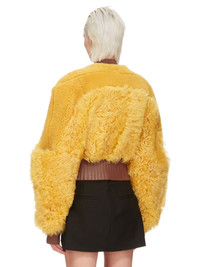 RICK OWENS FW24 PORTERVILLE GIRDERED BOMBER CROPPED IN LEMON/THROAT TOSCANA SHEARLING AND MERINO SHEARLING THIS GIRDERED BOMBER CROPPED IS ABOVE HIP-LENGTH WITH LONG SLEEVES. IT HAS A CENTRE FRONT ZIPPER AND RIBBED NECK, CUFFS AND WIDE WAISTBAND. IT FEATURES GIRDERED SHOULDERS AND YOKE, WHICH SLOPE DOWN TO FINISH IN POUCH POCKETS ABOVE THE OUTER ELBOWIT IS COMPLETELY REVERSIBLE THIS IS A COMBINATION OF TOSCANA SHEARLING AND MERINO SHEARLING THIS HEAVYWEIGHT SHEARLING LAMB LEATHER HAS A WAXY AND MATTE NAPPA FINISH AND A SOFT CURLY FUR. TANNED IN THE TUSCAN AREA OF ITALY, THESE SHEARLING MERINO HIDES ARE OF AUSTRALIAN ORIGIN, THE UNIQUE THICK FUR OF THESE ANIMALS MAKE THEM PERFECT FOR SHEARLING. BECAUSE THE HAIR IS NATURAL, THERE WILL BE VARIATIONS IN HAIR LENGTH AND TEXTURE, MAKING EACH PIECE UNIQUE. . THIS TANNERY IS LWG CERTIFIED WITH A SILVER RATING. - COLOR: LEMON/THROAT - MATERIAL: 100% LAMB SHEARLING REAL FUR - KNIT RIB COLLAR + WRIST BAND 100% NEW WOOL - BOTTOM 100% COW LEATHER - COLLAR AND ZIPPER EDGE 100% CALF LEATHER - SLEEVEES POCKET LINING 100% CALF LEATHER - MODEL IS 181CM TALL - MODEL WEARS SIZE 40