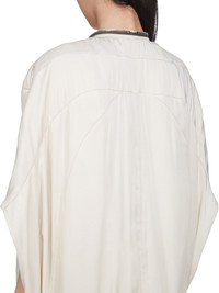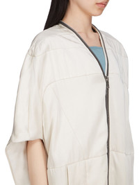 RICK OWENS SS25 HOLLYWOOD GIRDERED BUBBLE IN DINGE WASHED CHARMEUSE THIS GIRDERED BUBBLE IS BELOW-HIP LENGTH WITH A CENTER FRONT ZIPPER THAT IS FUNCTIONAL TO THE CHEST, AND CONTINUES AROUND THE NECKLINE TO THE CENTER BACK NECK. IT IS LINED WITH A THIN LEATHER STRIP, TO PROTECT THE NECK. IT FEATURES STIFF GIRDERED SHOULDERS AND YOKE, A GATHERED DRAPED BODY, WITH SIDE OPENINGS FOR THE ARMS, SIDE POCKETS AND A RIBBED WAISTBANDIT IS FULLY LINED AND HAS INTERNAL BUTTONED POCKETS THIS LIGHTWEIGHT AND FLUID CHARMEUSE IS HAS A SEMI-SHINY SURFACE AND WASHED FINISH. THIS FABRIC IS MADE FROM CERTIFIED VISCOSE WHICH ENSURES THAT THE FIBERS ARE PRODUCED FROM RESPONSIBLY MANAGED SOURCES AND NO DEFORESTATION OCCURS COLOR: DINGE MATERIAL: 61% ACETATE + 39% VISCOSE KNIT RIB BOTTOM 100% NEW WOOL LINING 100% CUPRO PADDING 100% POLYESTER BUTTONS 100% BUFFALO HORN MODEL IS 181CM TALL ITEM IS AVAILABLE IN ONE SIZE