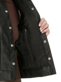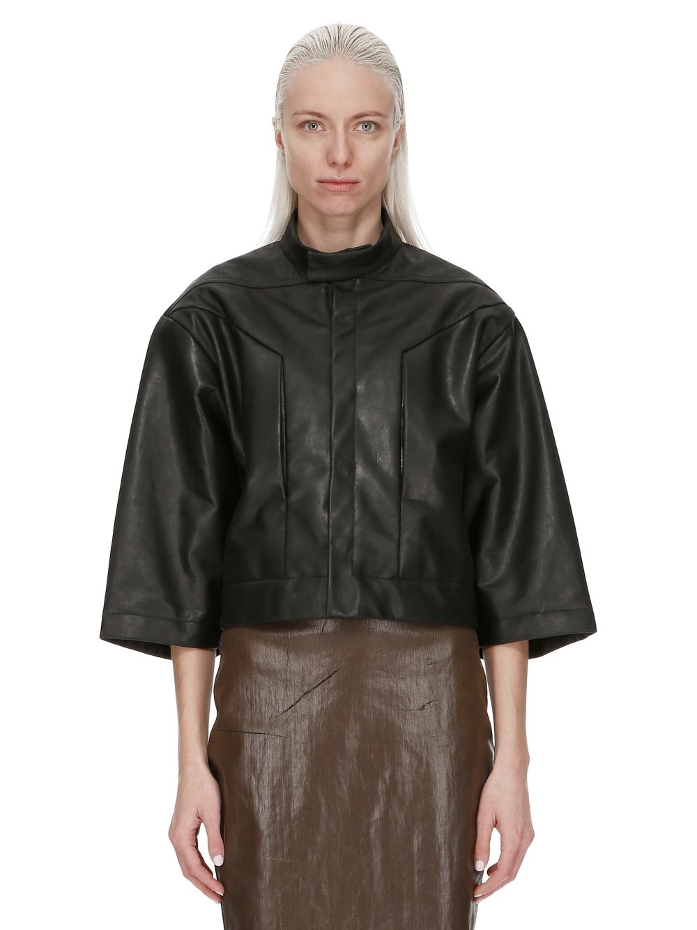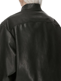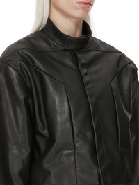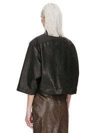 RICK OWENS FW23 LUXOR EDFU MAGNUM CROPPED IN BLACK RAVENNA CALF LEATHER THIS EDFU MAGNUM SHIRT CROPPED IS ABOVE-HIP LENGTH WITH ELBOW LENGTH SLEEVES AND A ROUNDED FIT. IT HAS A CENTRE FRONT OPENING WITH CONCEALED SNAP CLOSURES AND A STRUCTURED PRIESTS' COLLAR. IT HAS TWO FOG BREAST POCKETS WITH A VERTICAL OPENING AND CONCEALED SNAPS AND SIGNATURE LEVEL SHOULDER SEAMSIT IS FULLY LINED AND HAS TWO INTERNAL ZIPPERED POCKETS THIS MEDIUMWEIGHT CALF LEATHER IS VEG TANNED AND FINISHED USING NATURAL WAXES. IT IS SOFT WITH A WAXY AND SUPPLE HANDFEEL. TANNED IN THE NAPLES AREA OF ITALY AND HAND POLISHED TO ACHIEVE THE SEMI-SHINY SURFACE FINISH. VEG TANNING MEANS ONLY VEGETAL AND NATURAL TANNINS WERE USED IN THE PROCESS OF TANNING AND PRESERVING THIS LEATHER. - COLOR: BLACK - MATERIAL: 100% CALF LEATHER - BODY AND POCKET LINING 100% COTTON - SLEEVES LINING 100% CUPRO - PADDING 90% POLYESTER + + 10% ACRYLIC - MODEL IS WEARING SIZE 40 - MODEL IS 181 CM TALL
