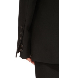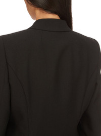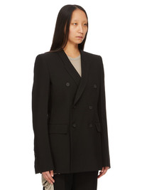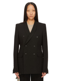 RICK OWENS FW24 PORTERVILLE JMF IN BLACK GRAIN DE POUDRE THIS JMF IS HIP-LENGTH WITH LONG SLIM SLEEVES. IT HAS A SHARP SHOULDER, A SLIM LAPEL AND A DOUBLE BREASTED FRONT WITH FOUR BUTTONS. IT HAS A WELT BREAST POCKET, SIDE POCKETS WITH FLAPS, TWO SIDE BACK VENTS AND FIVE BUTTON CUFFSIT IS FULLY LINED AND HAS TWO INTERNAL BUTTONED POCKETS THIS MEDIUMWEIGHT WOOL GRAIN DE POUDRE FABRIC HAS A ROUND AND SOFT HANDFEEL.THIS FABRIC IS MADE FROM RWS CERTIFIED VIRGIN WOOL WHICH ENSURES A HIGH STANDARD IN ANIMAL WELFARE, ENVIRONMENTAL SUSTAINABILITY AND SOCIAL RESPONSIBILITY. EACH BALE OF WOOL IS TRACEABLE BACK TO ITS SOURCE. - COLOR: BLACK - MATERIAL: 100% NEW WOOL - FRONT AND POCKETS LINING 100% COTTON - BACK AND SLEEVES LINING 100% CUPRO - BUTTONS 100% BUFFALO HORN - MODEL IS 181CM TALL - MODEL WEARS SIZE 40