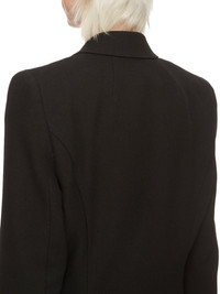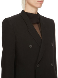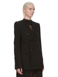 RICK OWENS FW24 PORTERVILLE JMF IN BLACK WOOL DRILL THIS JMF IS HIP-LENGTH WITH LONG SLIM SLEEVES. IT HAS A SHARP SHOULDER, A SLIM LAPEL AND A DOUBLE BREASTED FRONT WITH FOUR BUTTONS. IT HAS A WELT BREAST POCKET, SIDE POCKETS WITH FLAPS, TWO SIDE BACK VENTS AND FIVE BUTTON CUFFSIT IS FULLY LINED AND HAS TWO INTERNAL BUTTONED POCKETS THIS MEDIUMWEIGHT WOOL DRILL FABRIC HAS A DISTINCT DRILL TEXTURE AND A DRY HANDFEEL. THIS FABRIC IS MADE FROM GOTS CERTIFIED VIRGIN WOOL WHICH ENSURES A HIGH STANDARD IN ANIMAL WELFARE, ENVIRONMENTAL SUSTAINABILITY AND SOCIAL RESPONSIBILITY. EACH BALE OF WOOL IS TRACEABLE BACK TO ITS SOURCE. - COLOR: BLACK - MATERIAL: 100% WOOL - FRONT AND POCKETS LINING 100% COTTON - BACK AND SLEEVES LINING 100% CUPRO - BUTTONS 100% BUFFALO HORN - MODEL IS 181CM TALL - MODEL WEARS SIZE 40