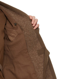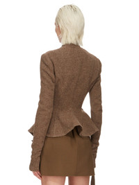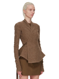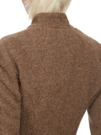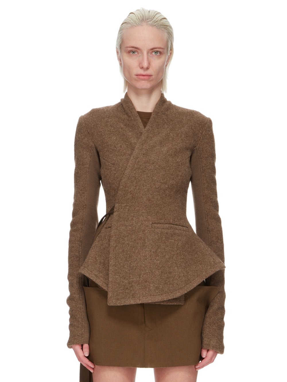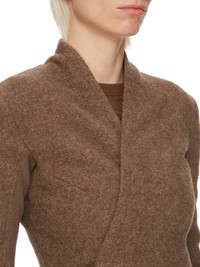 RICK OWENS FW24 PORTERVILLE HOLLYWOOD IN FAWN LODENETTE THIS HOLLYWOOD JKT IS ABOVE HIP LENGTH, WITH LONG SLIM SLEEVES WITH A KNIT UNDERSIDE. IT HAS A COLLARLESS V NECK WITH A DOUBLE BREASTED FRONT THAT WRAPS AND SECURES WITH A TIE AND INTERNAL CONCEALED ELASTIC BELT. IT IS A FITTED SHAPE THAT FLARES OVER THE HIPS, WITH SIDE BACK VENTSIT IS PARTIALLY LINED AND HAS TWO INTERNAL BUTTONED POCKETS THIS HEAVYWEIGHT PURE WOOL FABRIC HAS A BRUSHED AND SOFT HANDFEEL. IT IS WOVEN BY 5TH GENERATION FAMILY OWNED MILL IN AUSTRIA FOUNDED IN 1888 THAT SPECIALIZES IN MAKING HEAVY WOOL COAT FABRICS TO BE WORN DURING THE ALPINE WINTERS. ONLY PURIFIED GLACIER WATER FROM THE DACHSTEIN GLACIER IS USED TO TREAT THIS FABRIC. THE WOOL USED IN THIS QUALITY IS MULESING FREE. THIS MELANGE FAWN COLOR IS ACHIEVED BY MIXING DIFFERENT NATURAL WOOL TONES. - COLOR: FAWN - MATERIAL: 100% NEW WOOL - KNIT RIB UNDER SLEEVES 100% NEW WOOL - FRONT AND POCKETS LINING 100% COTTON - YOKE AND SLEEVES LINING 100% CUPRO - BUTTONS 100% BUFFALO HORN - MODEL IS 181CM TALL - MODEL WEARS SIZE 40