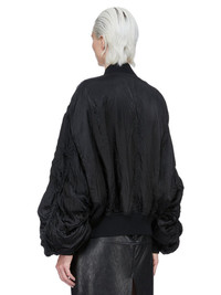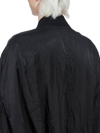 RICK OWENS SS26 TEMPLE SECCHIA FLIGHT IN BLACK CUPRO SATIN THIS SECCHIA FLIGHT IS OVERSIZED WITH LONG, GATHERED SLEEVES. IT HAS A RIBBED NECK, WRIST AND WAISTBAND FEATURES A CENTRE FRONT ZIPPER. IT HAS FRONT SIDE SNAP CLOSURE POCKETS WITH FLAPS. IT IS FULLY LINED AND HAS TWO INTERNAL ZIPPERED POCKETS THIS LIGHTWEIGHT AND FLUID CUPRO SATIN HAS A GLOSSY SURFACE, A SOFT HANDFEEL AND WASHED FINISH THIS FABRIC IS MADE USING CUPRO WHICH IS BIODEGRADABLE AND 100% PLANT BASED. AS IT’S MADE FROM COTTON WASTE, CUPRO HELPS FIND A PURPOSE TO FIBERS THAT WOULD OTHERWISE BE DISCARDED COLOR: BLACK MATERIAL:100% CUPRO KNIT RIB COLLAR, WRIST BAND AND BOTTOM 92% NEW WOOL + + 6% NYLON + 2% ELASTANE PADDING 100% POLYESTER MODEL IS 181CM TALL MODEL WEARS SIZE 40