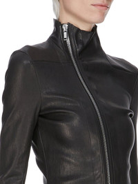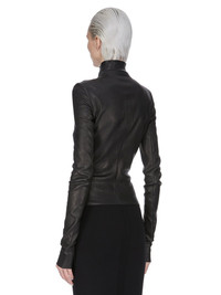 RICK OWENS SS25 HOLLYWOOD IN BLACK VEG STRETCH LAMB LEATHER THIS GARY JACKET IS BELOW-WAIST LENGTH WITH A SKIN TIGHT FIT. IT HAS LONG SLEEVES, A HIGH NECK WITH AN ASYMMETRICAL ZIPPER FRONT OPENING AND LEVEL SHOULDER SEAMS WITH TOPSTITCHING THIS STRETCH LAMB LEATHER HAS A SMALL GRAIN TEXTURE AND A SEMI-SHINY FINISH. IT IS VEG TANNED AND FINISHED USING NATURAL WAXES AND ANILINE WHICH MAKES A SUPPLE HANDFEEL. BECAUSE THIS SKIN IS NAKED, NOT FINISHED USING ANY PIGMENTS COVERING THE SKIN, NATURAL MARKINGS AND SHADINGS ARE VISIBLE WHICH MAKES EACH SKIN AND PRODUCT UNIQUE. VEG TANNING MEANS ONLY VEGETAL AND NATURAL TANNINS WERE USED IN THE PROCESS OF TANNING AND PRESERVING THIS LEATHER THIS LEATHER IS MADE BY A SECOND GENERATION FAMILY OWNED TANNERY IN THE SOUTH OF FRANCE SPECIALIZING ONLY IN STRETCH LEATHER PRODUCTION. EACH SKIN IS STRETCHED OUT TO ITS LIMIT AND BONDED TO A COTTON AND LYCRA FABRIC BACKING. WHEN DYED, THE HEAT OF THE PROCESS ACTIVATES THE LYCRA ELASTIC FIBRES THAT SHRINK THE FABRIC AND WITH IT THE SKIN, BACK TO ITS ORIGINAL SIZE. THE LEATHER THEN EXITS THE PROCESS AS STRETCH. COLOR: BLACK MATERIAL: 65% LAMB LEATHER + 34% COTTON + 1% SPANDEX MODEL IS 181CM TALL MODEL WEARS SIZE 40