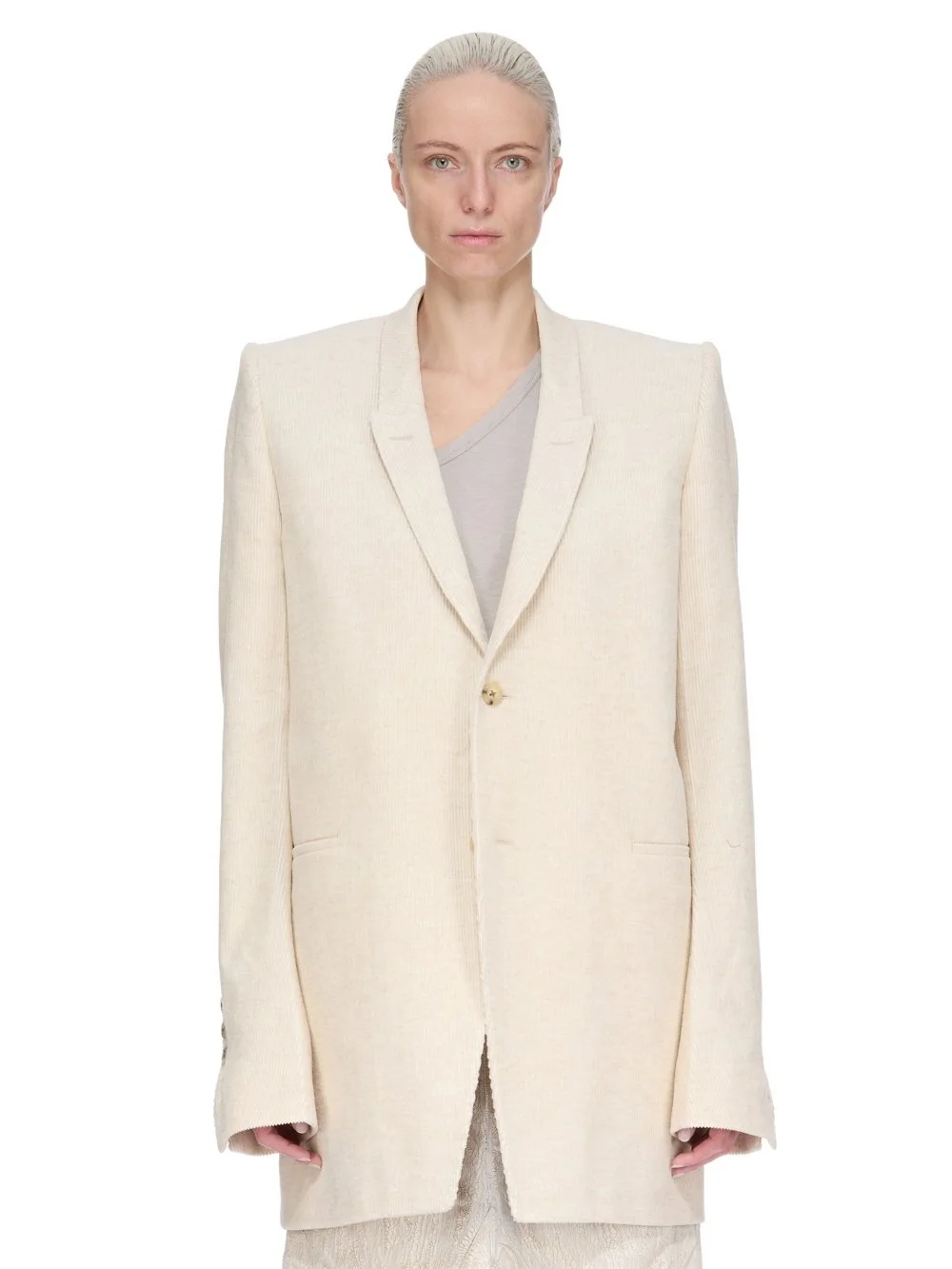 RICK OWENS FW25 CONCORDIANS DIRT TAILORED LS JKT IN NATURAL LINEN CORDUROY THIS DIRT TAILORED LS JKT IS BELOW HIP LENGTH WITH A REGULAR SHOULDER PAD AND LONG SLEEVES. IT HAS A SLIM LAPEL WITH TWO BUTTON FRONT CLOSURE AND SIDE FRONT JET POCKETS. IT HAS A CENTRE BACK VENT AND FEATURES AN ADJUSTABLE, THIN COTTON WEBBING DISCO STRAP, WITH CLIP, ACROSS THE BACK YOKEIT IS FULLY LINED WITH TWO INTERNAL BUTTONED POCKETS THIS MEDIUMWEIGHT COTTON AND LINEN BLEND CORDUROY HAS A SOFT HANDFEEL THE COLOR OF THIS CORDUROY IS NATURAL WITH SLUBS AND IMPURITIES VISIBLE AS A PART OF THE COLORATION THIS FABRIC IS MADE USING GOTS CERTIFIED ORGANIC COTTON WHICH MEANS THE NATURAL FIBER IS GROWN WITHOUT HARMFUL CHEMICALS, LEAVING OUR SOIL, AIR AND WATER CLEANER FROM CONTAMINATES COLOR: NATURAL MATERIAL: 74% COTTON + 26% LINEN BODY AND POCKETS LINING 100% COTTON SLEEVES LINING 100% CUPRO BUTTONS 100% BUFFALO HORN MODEL IS 181CM TALL MODEL WEARS SIZE 40