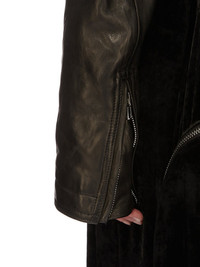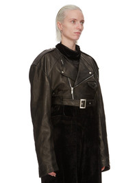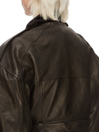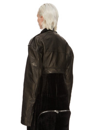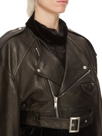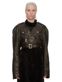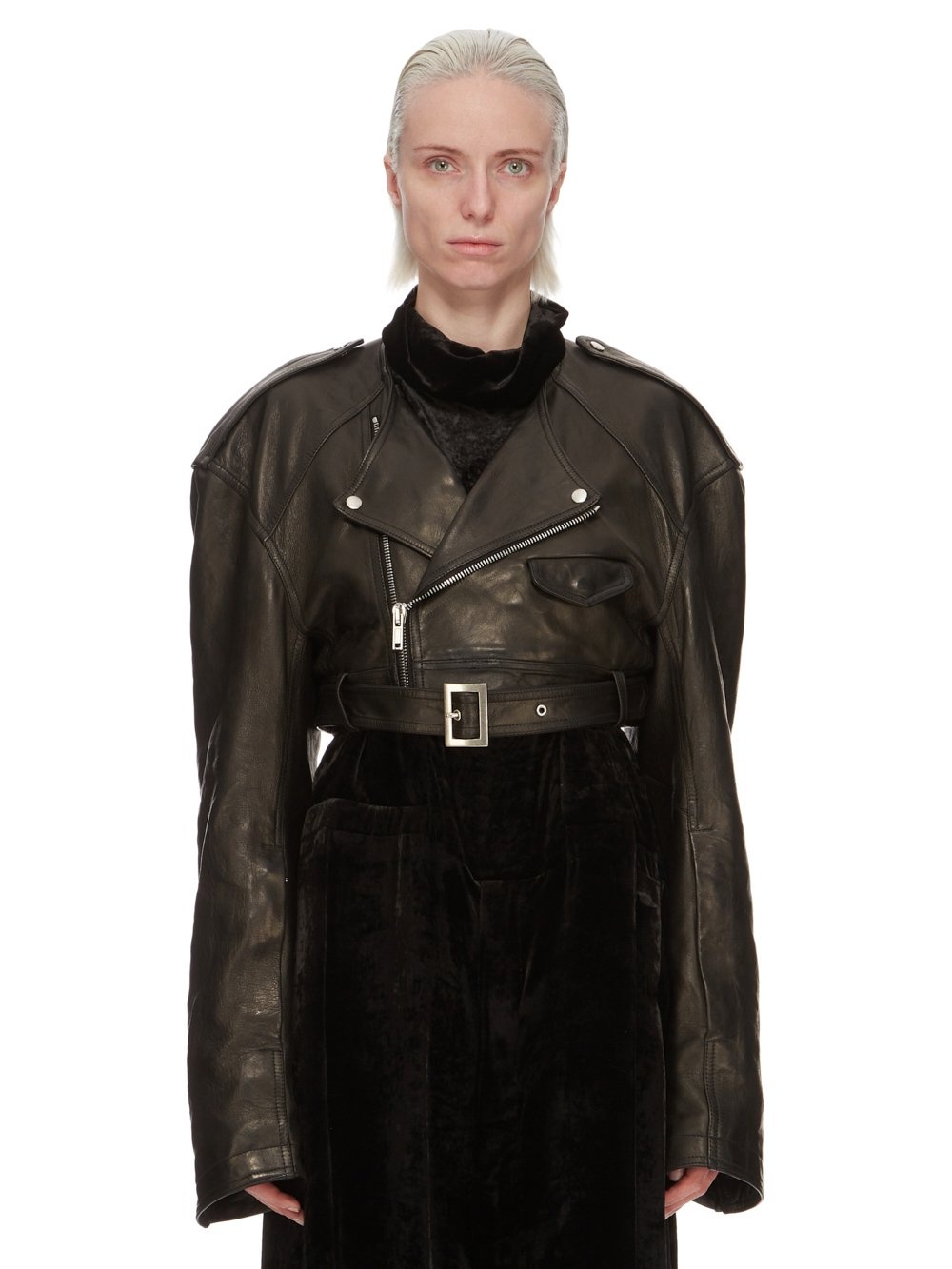 RICK OWENS FW24 PORTERVILLE MICRO BIKER IN BLACK VEG NAPPA LAMB THIS MICRO BIKER IS CROPPED WAIST LENGTH WITH AN OVERSIZED FIT. IT HAS A BIKER DOUBLE BREASTED FRONT WITH OFF-CENTRE ZIPPER, A COLLARLESS NECK AND WIDE LAPEL WITH SILVER YKK SNAPS. IT FEATURES CURVED LONG SLEEVES WITH ZIPPERED CUFFS, AND SHOULDER EPAULETTES WITH SNAPS. IT HAS A FLAP POCKET WITH INTERNAL SNAP ON THE SIDE FRONT, AND A WAISTBAND WITH BELT RUNNING THROUGH BELT LOOPS WITH A HANDMADE SOLID BRASS PALLADIUM PLATED BUCKLE THIS MEDIUMWEIGHT LAMB LEATHER IS VEG TANNED AND FINISHED USING NATURAL WAXES AND ANILINE WHICH MAKES A SUPPLE HANDFEEL. BECAUSE THIS SKIN IS NAKED, NOT FINISHED USING ANY PIGMENTS COVERING THE SKIN, NATURAL MARKINGS AND SHADINGS ARE VISIBLE WHICH MAKES EACH SKIN AND PRODUCT UNIQUE. VEG TANNING MEANS ONLY VEGETAL AND NATURAL TANNINS WERE USED IN THE PROCESS OF TANNING AND PRESERVING THIS LEATHER. - COLOR: BLACK - MATERIAL: 100% LAMB LEATHER - FRONT LINING AND SMALL POCKET 100% COTTON - BACK SLEEVES AND POCKET SLEEVES LINING 100% CUPRO - MODEL IS 181CM TALL - MODEL WEARS SIZE 40