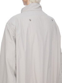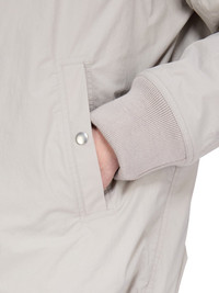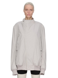 RICK OWENS FW25 CONCORDIANS HOLLYWOOD FLIGHT IN PEARL MATTE NYLON THIS HOLLYWOOD FLIGHT IS BELOW HIP LENGTH WITH LONG SLEEVES. IT HAS AN OFF-CENTRE ZIPPER WITH TOP SNAP, A SMALL, ROUNDED, FUNNEL NECK AND RIBBED CUFF AND HEM, AND SIDE SNAP POCKETS AND A ZIPPERED POCKET ON THE LEFT FOREARM. IT FEATURES A DOUBLE SNAP DETAIL ON THE BACK YOKE. IT IS FULLY LINED AND HAS INTERNAL ZIPPERED POCKETS THIS LIGHTWEIGHT NYLON HAS A BRUSHED, PEACHY FINISH AND A DRY HANDFEEL. IT IS WATER REPELLENT COLOR: PEARL MATERIAL: 100% NYLON KNIT RIB BOTTOM AND CUFFS 100% NEW WOOL SLEEVES LINING 100% CUPRO POCKETS LINING 100% COTTON PADDING 100% POLYESTER MODEL IS 181CM TALL MODEL WEARS SIZE 40