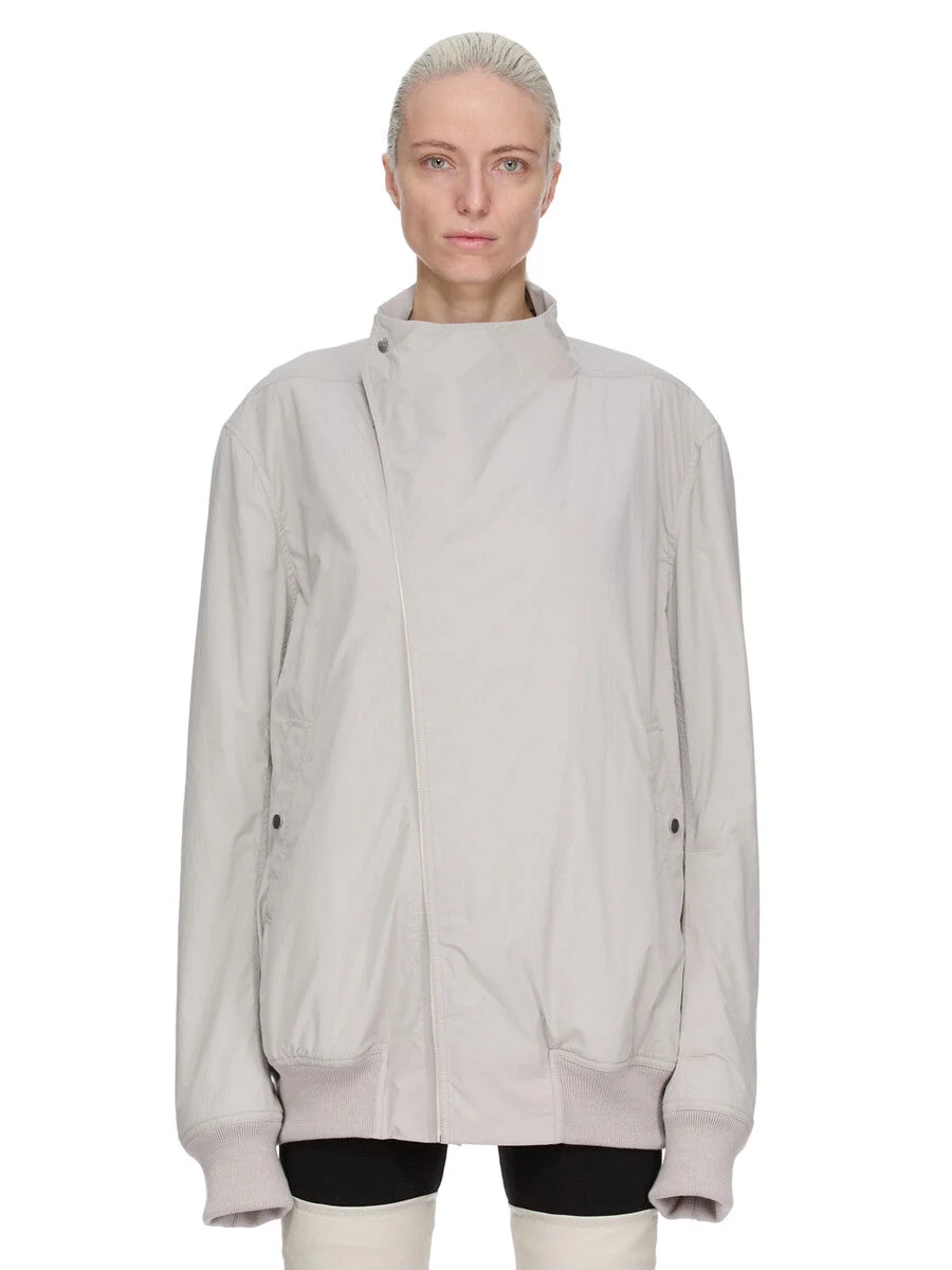 RICK OWENS FW25 CONCORDIANS HOLLYWOOD FLIGHT IN PEARL MATTE NYLON THIS HOLLYWOOD FLIGHT IS BELOW HIP LENGTH WITH LONG SLEEVES. IT HAS AN OFF-CENTRE ZIPPER WITH TOP SNAP, A SMALL, ROUNDED, FUNNEL NECK AND RIBBED CUFF AND HEM, AND SIDE SNAP POCKETS AND A ZIPPERED POCKET ON THE LEFT FOREARM. IT FEATURES A DOUBLE SNAP DETAIL ON THE BACK YOKE. IT IS FULLY LINED AND HAS INTERNAL ZIPPERED POCKETS. THIS LIGHTWEIGHT NYLON HAS A BRUSHED, PEACHY FINISH AND A DRY HANDFEEL. IT IS WATER REPELLENT. COLOR: PEARL MATERIAL: 100% NYLON KNIT RIB BOTTOM AND CUFFS 100% NEW WOOL SLEEVES LINING 100% CUPRO POCKETS LINING 100% COTTON PADDING 100% POLYESTER MODEL IS 181CM TALL MODEL WEARS SIZE 40