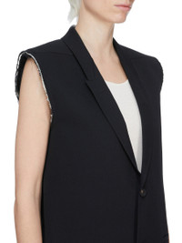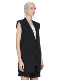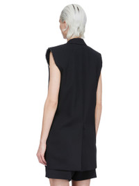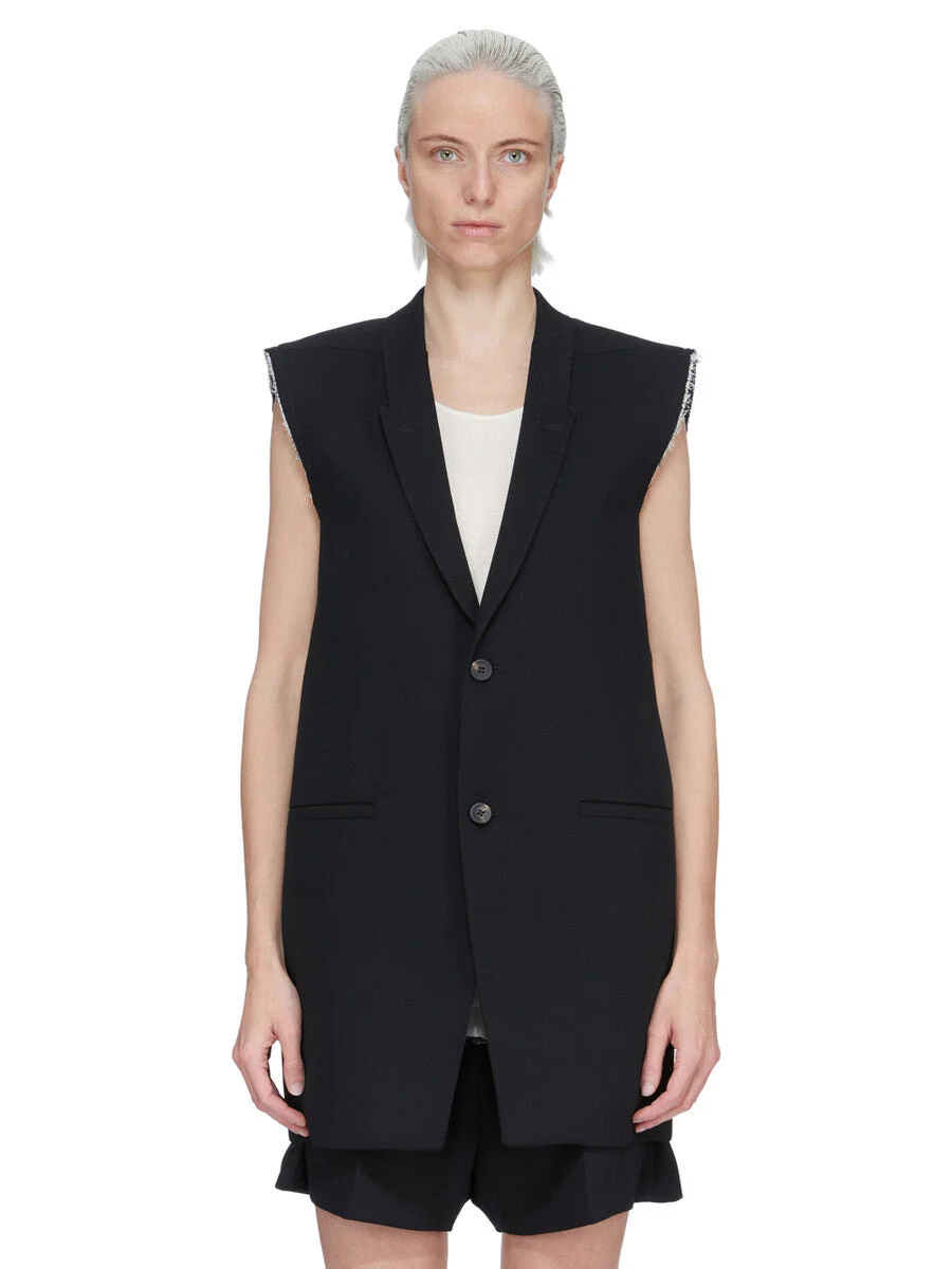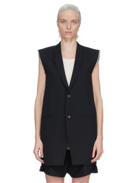 RICK OWENS SS26 TEMPLE SL CONCORDIAN JKT IN BLACK TWISTED WOOL THIS SL CONCORDIAN JKT IS BELOW-HIP LENGTH AND SLEEVELESS. IT HAS CLASSIC SLOPING SHOULDERS WITH LEVEL SHOULDER SNAPS AND A SLIM LAPEL, WITH DOUBLE BUTTON CLOSURE AND TWO LOWER SIDE FRONT JET POCKETS. IT HAS RAW CUT ARMHOLES AND A BACK VENT. IT IS FULLY LINED AND HAS TWO INTERNAL BUTTONED POCKETS. THIS MEDIUMWEIGHT WOOL IS WOVEN USING HIGH TWISTED YARNS WHICH CREATES THE SURFACE TEXTURE AND DRY HANDFEEL. IT IS MADE IN A FIFTH GENERATION MILL, FOUNDED IN 1883 IN AICHI PREFECTURE, JAPAN. COLOR: BLACK MATERIAL:100% WOOL BODY AND POCKETS LINING 100% COTTON YOKE LINING 100% CUPRO BUTTONS 100% BUFFALO HORN MODEL IS 181CM TALL MODEL WEARS SIZE 40