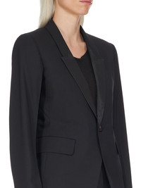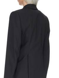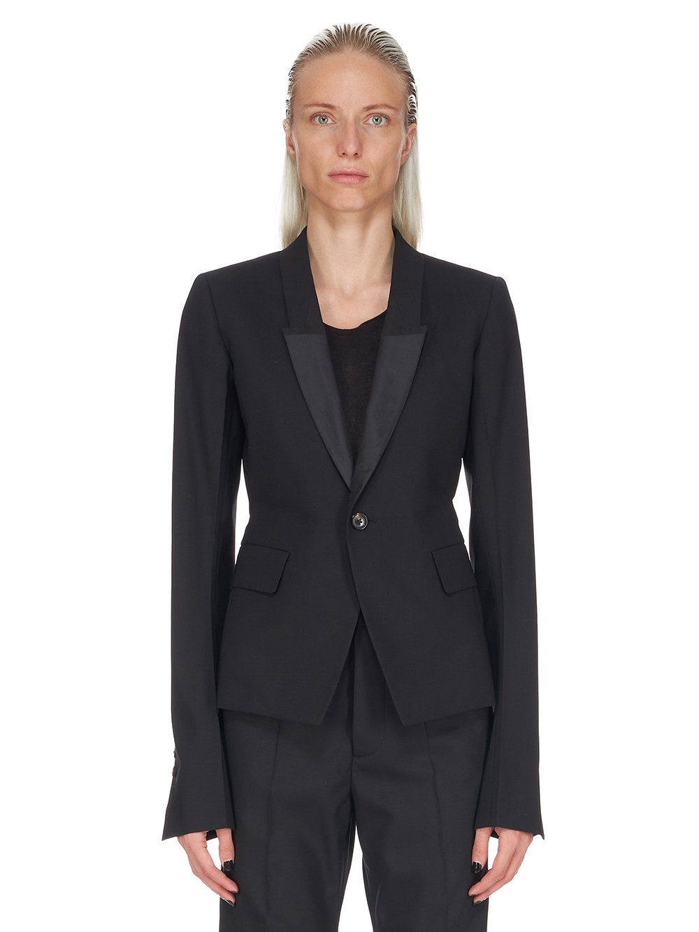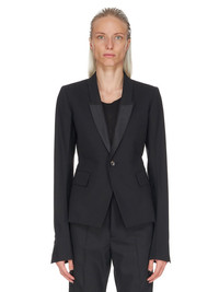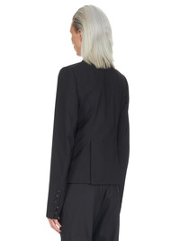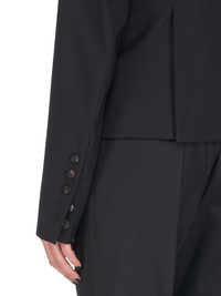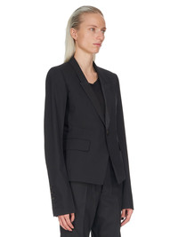 RICK OWENS FW22 STROBE 60CM SOFT IN BLACK PAPER FINISH WOOL TAILORING AND SILK TAFFETAS THIS 60CM SOFT TAILORED JACKET IS ABOVE HIP LENGTH WITH LONG SLIM SLEEVES AND BUTTON CUFFS. IT FEATURES A SLIM LAPEL WITH GEOMETRIC GLYPH CUT, A SINGLE BUTTON CLOSURE, TWO SIDE FRONT POCKETS WITH FLAPS, INTERNAL BUTTON CLOSURE POCKET AND A DOUBLE VENT ON BACK THIS VIRGIN WOOL TAILORING QUALITY HAS A DRY HANDFEEL PAPER FINISH AND IS WOVEN IN THE BIELLA REGION OF ITALY RENOWNED FOR ITS LONG TRADITION OF TAILORED WOOL.WE CHOSE TO MAKE THIS PRODUCT USING ZQ CERTIFIED VIRGIN WOOL BECAUSE EACH BALE OF WOOL IS TRACEABLE BACK TO ITS SOURCE AND IT ENSURES A HIGH STANDARD IN ANIMAL WELFARE, ENVIRONMENTAL SUSTAINABILITY AND SOCIAL RESPONSIBILITY - COLOR: BLACK - MATERIAL: 96% NEW WOOL + 4% ELASTANE - NECK DETAIL 100% SILK - BODY LINING 53% VISCOSE + 47% CUPRO - SLEEVES LINING 100% CUPRO - POCKETS LINING 100% COTTON - MODEL IS WEARING SIZE 40 - MODEL IS 181 CM TALL