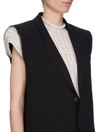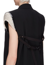 RICK OWENS SS25 HOLLYWOOD DIRT TAILORED SL IN BLACK LIGHT POUDRE THIS DIRT TAILORED JKT SL IS BELOW-HIP LENGTH, AND SLEEVELESS, WITH A REGULAR SHOULDER PAD THAT IS RAW CUT AND EXPOSED. IT HAS A SLIM LAPEL WITH TWO BUTTON FRONT CLOSURE AND SIDE FRONT JET POCKETS. IT HAS A CENTER BACK VENT AND FEATURES A THIN, ADJUSTABLE, COTTON WEBBING DISCO STRAP, WITH CLIP, ACROSS THE BACK YOKE IT IS FULLY LINED AND HAS TWO INTERNAL BUTTONED POCKETS THIS MEDIUMWEIGHT GRAIN DE POUDRE WOOL IS MATTE AND HAS A SOFT AND FLUID HAND FEEL. COLOR: BLACK MATERIAL: 100% WOOL LINING 100% CUPRO BUTTONS 100% BUFFALO HORN MODEL IS 181CM TALL MODEL WEARS SIZE 40