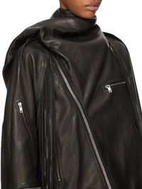 RICK OWENS FW25 CONCORDIANS RUNWAY CROPPED SCARF FLIGHT IN BLACK VEG NAPPA LAMB THIS CROPPED SCARF FLIGHT IS BELOW-WAIST LENGTH AND HAS LONG WIDE SLEEVES. IT FEATURES AN OFF CENTRE ZIPPER CLOSURE THAT CLOSES ON THE SIDE NECK AND IS COVERED BY AN ATTACHED SCARF SEGMENT THAT IS WORN OVER THE RIGHT SHOULDER. IT HAS A BELT AROUND THE BOTTOM HEM THAT FASTENS WITH A BUCKLE AND SNAP DETAIL AND HAS SIDE FRONT VERTICAL ZIPPERED POCKETS. IT ALSO FEATURES A HORIZONTAL ZIPPERED LEFT CHEST AND RIGHT FRONT ELBOW POCKETS, AND A DIAGONAL STROBE POCKET ON THE UPPER RIGHT ARM. THIS VERSION HAS A FRINGED BACK AND SLEEVES THIS MEDIUMWEIGHT LAMB LEATHER IS VEG TANNED AND FINISHED USING NATURAL WAXES AND ANILINE WHICH MAKES A SUPPLE HANDFEEL. BECAUSE THIS SKIN IS NAKED, NOT FINISHED USING ANY PIGMENTS COVERING THE SKIN, NATURAL MARKINGS AND SHADINGS ARE VISIBLE WHICH MAKES EACH SKIN AND PRODUCT UNIQUE VEG TANNING MEANS ONLY VEGETAL AND NATURAL TANNINS WERE USED IN THE PROCESS OF TANNING AND PRESERVING THIS LEATHER COLOR: BLACK MATERIAL: 100% LAMB LEATHER MODEL IS 181CM TALL ITEM IS AVAILABLE IN ONE SIZE