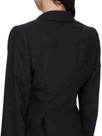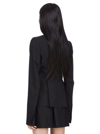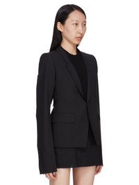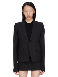 RICK OWENS SS25 HOLLYWOOD 60CM SOFT JACKET IN BLACK PAPER FINISH WOOL THIS 60CM SOFT TAILORED JACKET IS ABOVE-HIP LENGTH WITH LONG, SLIM SLEEVES AND 5 BUTTON CUFFS. IT FEATURES A SLIM LAPEL WITH GEOMETRIC GLYPH CUT, A SINGLE BUTTON CLOSURE, TWO SIDE FRONT POCKETS WITH FLAPS AND A DOUBLE VENT ON BACKIT IS FULLY LINED AND HAS TWO INTERNAL BUTTONED POCKETS THIS MEDIUMWEIGHT WOOL FABRIC HAS A DRY PAPERY HANDFEEL. IT IS WOVEN IN THE BIELLA REGION OF ITALY RENOWNED FOR ITS LONG TRADITION OF TAILORED WOOL. THIS FABRIC IS MADE FROM ZQ CERTIFIED VIRGIN WOOL WHICH ENSURES A HIGH STANDARD IN ANIMAL WELFARE, ENVIRONMENTAL SUSTAINABILITY AND SOCIAL RESPONSIBILITY. EACH BALE OF WOOL IS TRACEABLE BACK TO ITS SOURCE COLOR: BLACK MATERIAL: 96% NEW WOOL + 4% ELASTANEFRONT AND POCKETS LINING 100% COTTONBACK AND SLEEVES LINING 100% CUPRO BUTTONS 100% BUFFALO HORN MODEL IS 181CM TALL MODEL WEARS SIZE 38