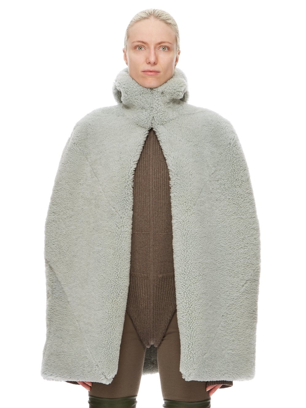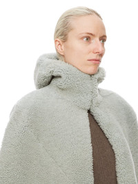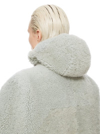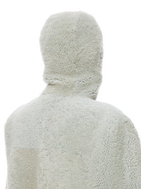 RICK OWENS FW24 PORTERVILLE CAPE IN PALE BLUE MERINO SHEARLING THIS CAPE IS FINGERTIP LENGTH. IT HAS LEVEL SHOULDER SEAMS, AND A CLOSE FITTING, SEAMED HOOD. IT HAS A HIGH FRONT NECK THAT SECURES WITH HOOKS, LEAVING THE CENTRE FRONT TO FALL OPEN TO THE HEMIT IS FULLY LINED WITH TWO INTERNAL ZIPPERED POCKETS THIS HEAVYWEIGHT SHEARLING LAMB LEATHER HAS A WAXY AND MATTE NAPPA FINISH AND A SOFT CURLY FUR. TANNED IN THE TUSCAN AREA OF ITALY, THESE SHEARLING MERINO HIDES ARE OF AUSTRALIAN ORIGIN, THE UNIQUE THICK FUR OF THESE ANIMALS MAKE THEM PERFECT FOR SHEARLING. BECAUSE THE HAIR IS NATURAL, THERE WILL BE VARIATIONS IN HAIR LENGTH AND TEXTURE, MAKING EACH PIECE UNIQUE. . THIS TANNERY IS LWG CERTIFIED WITH A SILVER RATING. - COLOR: PALE BLUE - MATERIAL: 100% LAMB SHEARLING REAL FUR - FRONT AND POCKETS LINING 97% COTTON + 3% ELASTANE - BACK AND HOOD LINING 100% CUPRO - MODEL IS 181CM TALL - MODEL WEARS SIZE 40