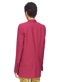 RICK OWENS SS23 EDFU WALRUS TUX IN LIGHT WOOL AND COTTON POPLIN THIS WALRUS TUX JACKET IS BELOW HIP LENGTH WITH LONG SLEEVES. IT HAS A SLIM TUX LAPEL WITH A SINGLE BUTTON FRONT. IT FEATURES POCKETS IN THE SIDE SEAM, 5 BUTTON CUFFS, CREASED SLEEVES. IT IS FULLY LINED AND HAS INTERNAL BUTTONED POCKETS THIS IS A COMBINATION OF LIGHT WOOL AND COTTON POPLIN. THIS LIGHTWEIGHT TRAVEL SUITING IS WOVEN IN THE BIELLA REGION OF ITALY RENOWNED FOR ITS LONG TRADITION OF TAILORED WOOL - COLOR: FUCHSIA - MATERIAL: 100% NEW WOOL - NECK DETAIL 100% COTTON - FRONT AND POCKETS LINING 100% COTTON - BACK LINING 53% VISCOSE + 47% CUPRO - SLEEVES LINING 100% CUPRO - MODEL IS WEARING SIZE 40 - MODEL IS 181 CM TALL