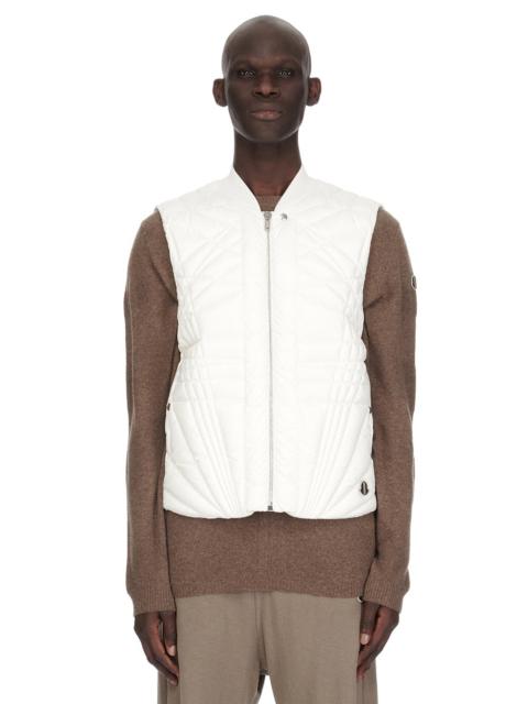 MONCLER + RICK OWENS FW24 MEGAPENTA FLIGHT VEST IN MILK RECYCLED LONGUE SAISON WITH RADIANCE QUILTING THIS MEGAPENTA FLIGHT VEST IS ABOVE HIP LENGTH AND SLEEVELESS. IT HAS A CENTER FRONT ZIPPER WITH PLACKET AND TOP SNAP, SIDE FRONT WELT POCKETS WITH SNAPS AND A RIBBED COLLAR. IT FEATURES THE SIGNATURE LEVEL SHOULDER SEAMS AND A COTTON WEBBING STRAP WITH RIVET DETAIL ON THE BACK YOKE. IT IS A DUVET JACKET THAT FEATURES THE MEGAPENTA QUILTING DESIGN, WITH LINES CRISS-CROSSING AROUND THE BODY, IN A LAYERED PENTAGRAM DESIGN. IT HAS THE MONCLER + RICK OWENS EMBROIDERED LOGO PATCH ON THE LOWER LEFT HIP THIS AIRY AND LIGHTWEIGHT DUVET MATERIAL IS MADE USING CERTIFIED RECYCLED POLYESTER - COLOR: MILK - MATERIAL: 100% POLYESTER - INSERT 46% ACRYLIC + 42% WOOL + 10% NYLON + 2% ELASTANE - LINING 100% POLYESTER - PADDING 90% GOOSE DOWN + 10% GOOSE FEATHERS - MALE MODEL IS 189 CM TALL, FEMALE MODEL IS 181 CM TALL - MODELS ARE WEARING SIZE 2